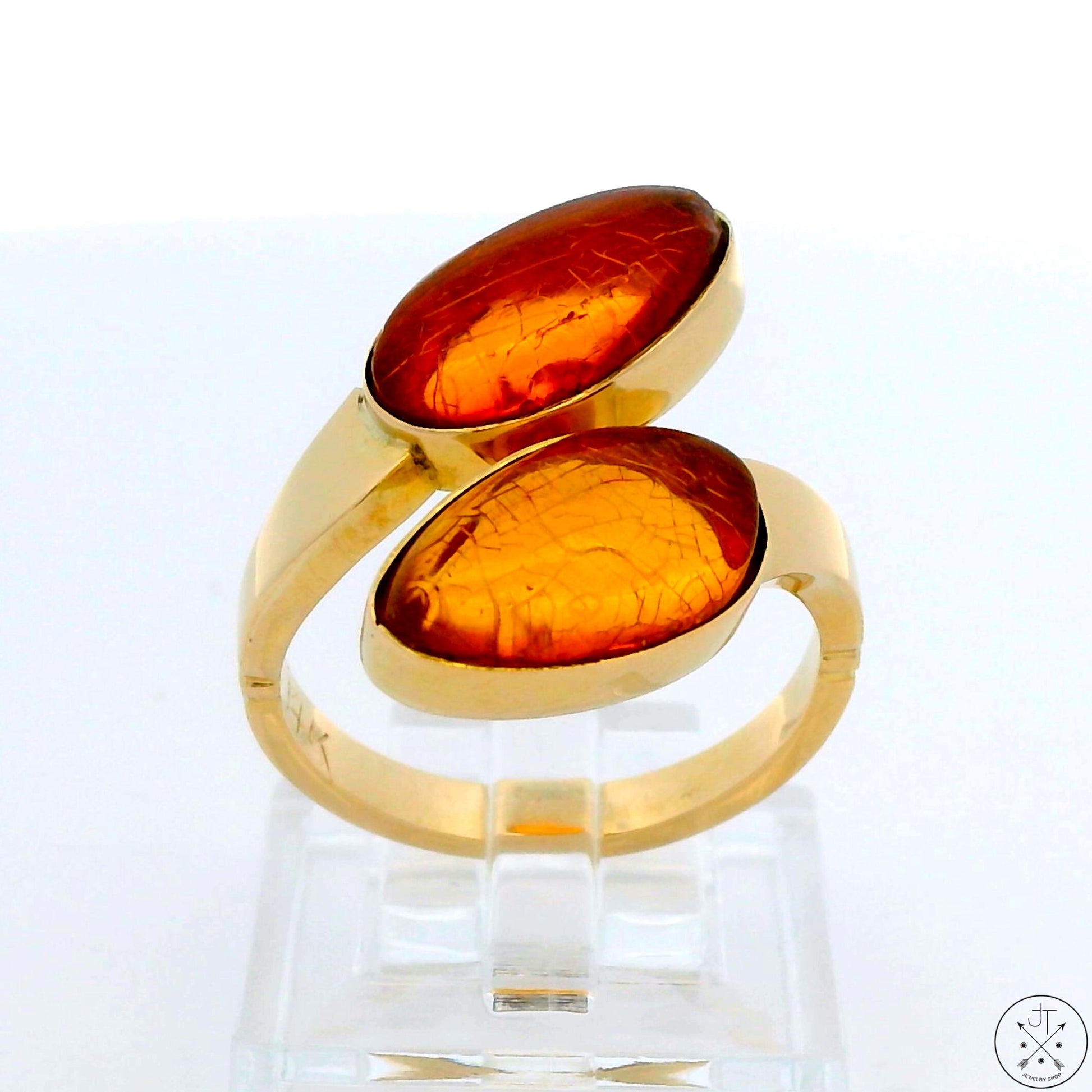 This stunning double stone ring features two beautifully crafted natural Amber cabochons, elegantly set in a sleek gold band. The warm hues of the Amber create a captivating contrast against the polished Gold, making it a perfect accessory for any occasion. Stamped '14k', this classy 1980s ring is a size 8, but its unique design allows some give, like to easily fit over a larger knuckle. The ring is in excellent condition for its age, with little wear to the Gold and some crazing showing on the natural Amber.