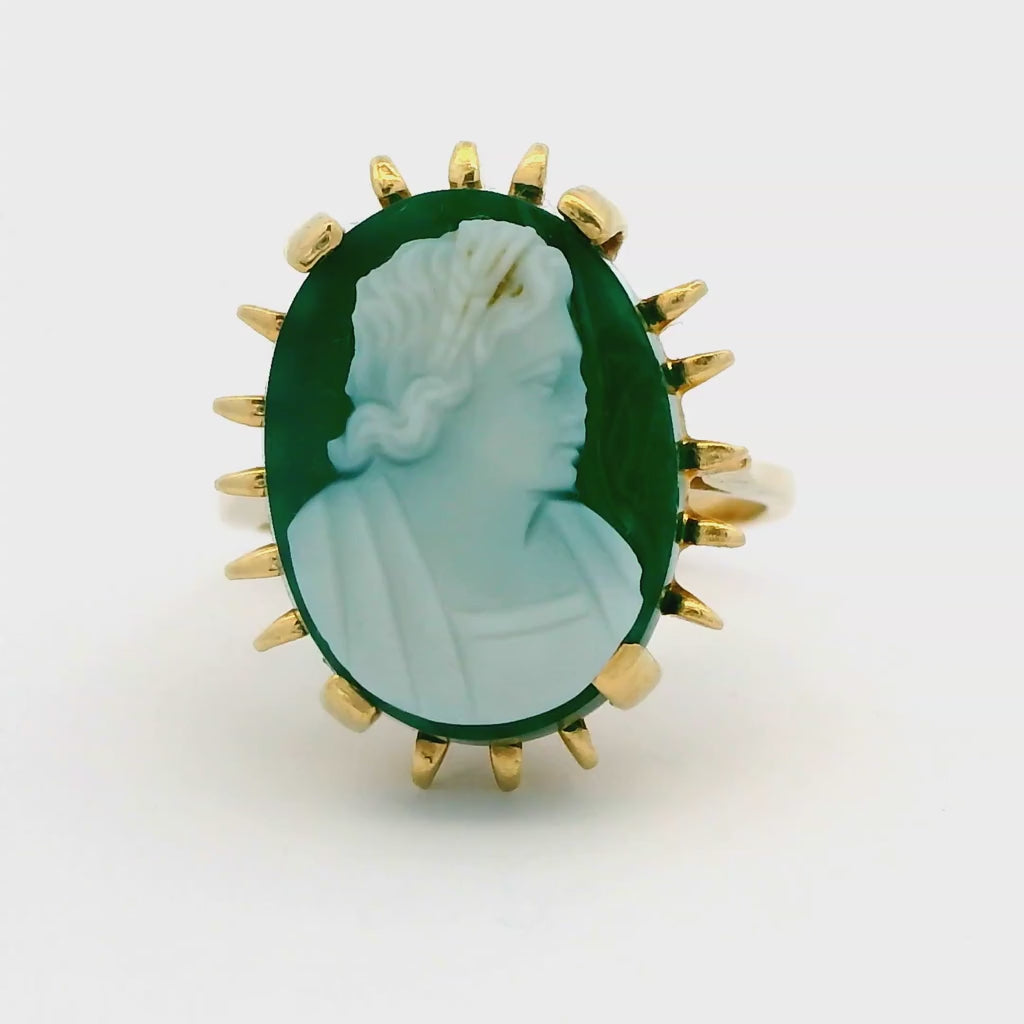 Stunning vintage solid 14k Yellow Gold ring with a Green Agate hardstone Cameo set in a striking 18.8 mm x 15.5 mm gallery. Stamped '14k', this beautiful estate Cameo ring weighs approximately 5.22 grams and is in very good condition.