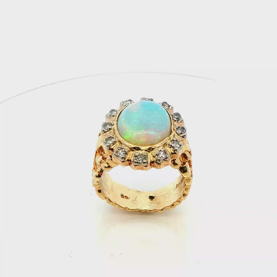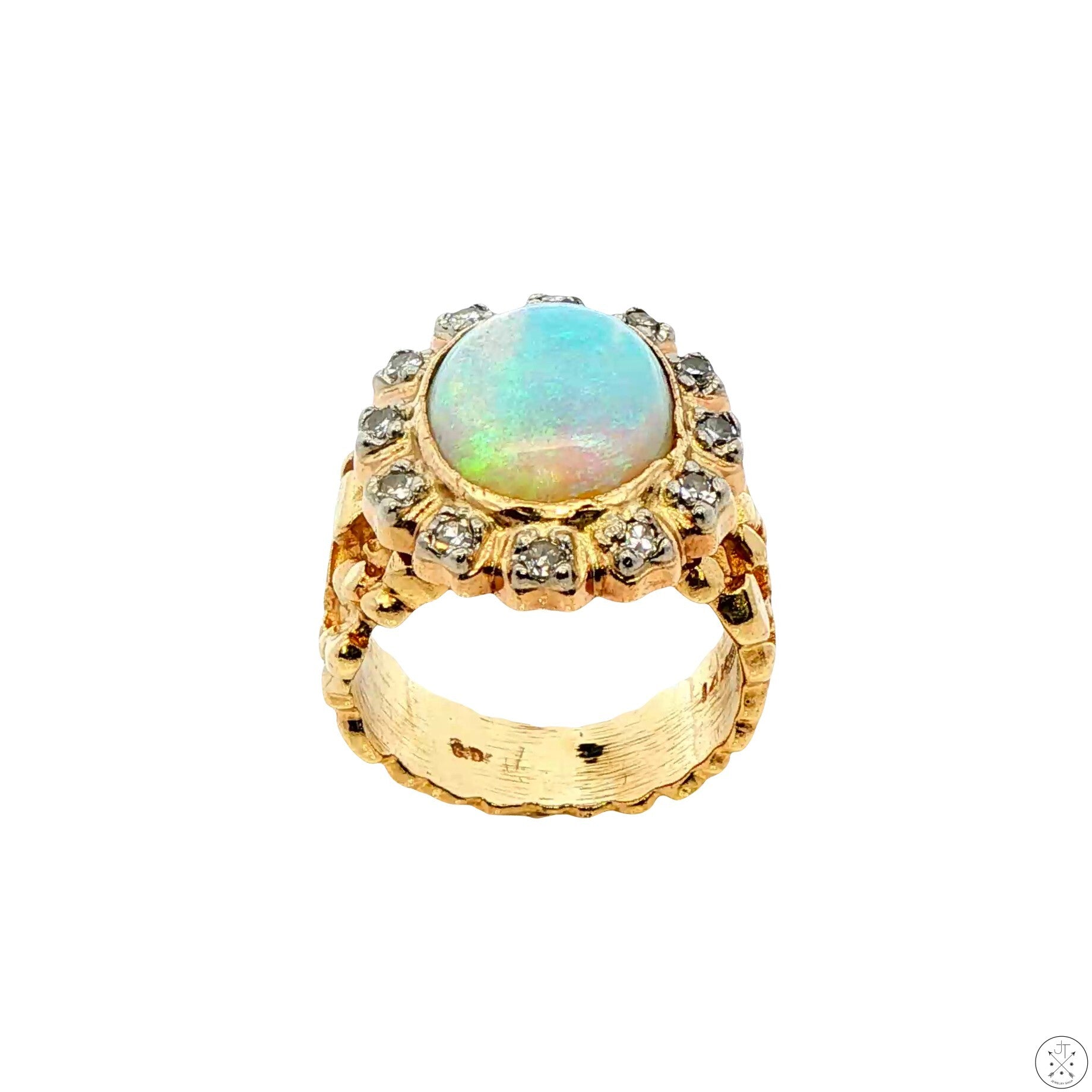 Stunning, solid 14k Yellow Gold nugget-style ring with a beautiful bezel-set approximately 3.91 carat natural Australian Crystal Opal cabochon surrounded by a halo of round-faceted natural Diamonds, averaging approximately H-color and SI2-clarity. Stamped with a name, 'gd' and '14k', this wonderful, circa-1980s, size 5 ring weighs approximately 9.30 grams and is in very good condition. The oval-shaped top of the ring measures approximately 18 x 16 mm, and the top of the opal rises to 7 mm above the finger. This translucent Crystal Opal has stunning flashes of green with accents of blue and violet depending on the light.