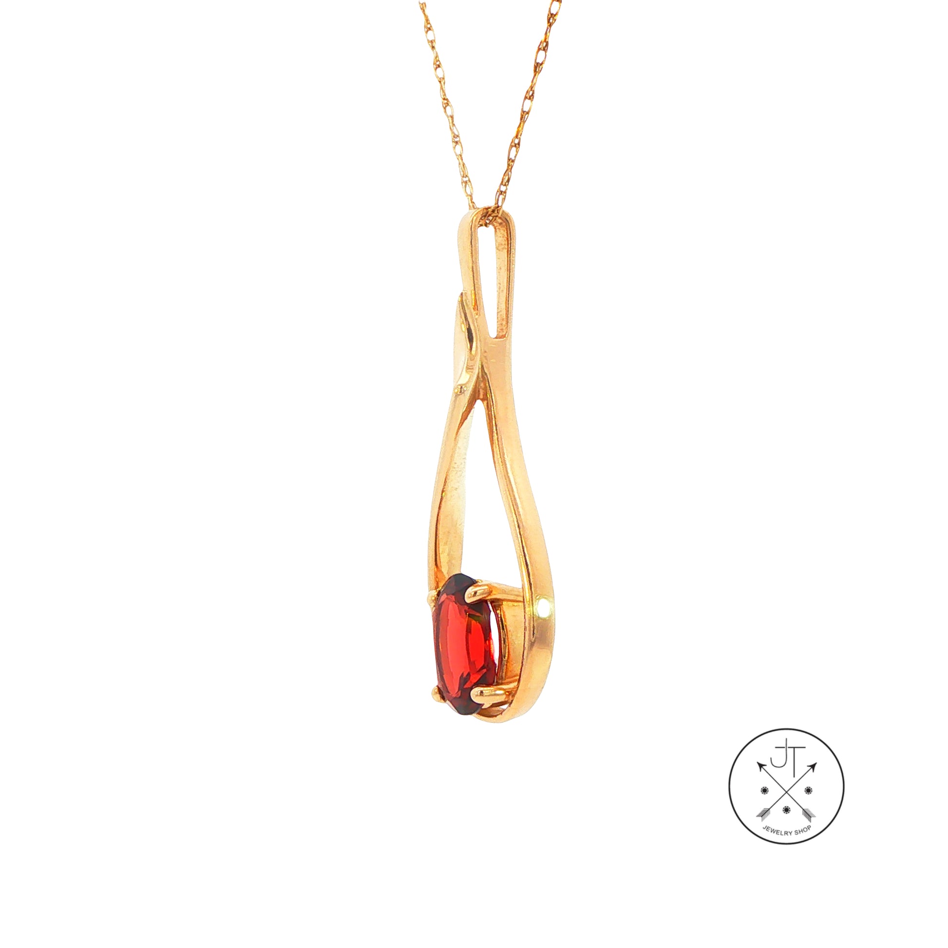 This beautiful vintage pendant necklace makes a stunning addition to any occasion. The orangish-red 8 x 6 mm natural Garnet sits almost floating in the sweeping drop pendant design for a timeless elegance. Stamped '14k', the 19-inch-long 1 mm cable chain is secured with a spring ring closure. The pendant is stamped 'p14k' beneath the elongated bale that can accommodate up to a 1.8 mm chain. This beautiful necklace weighs approximately 3.09 grams and is in very good condition.