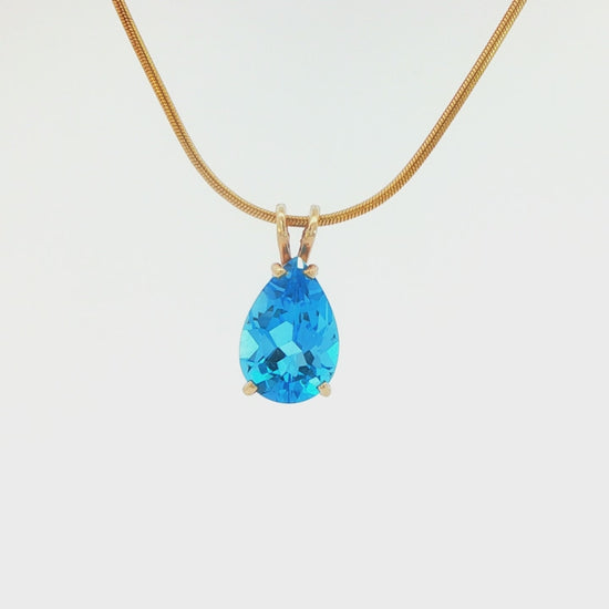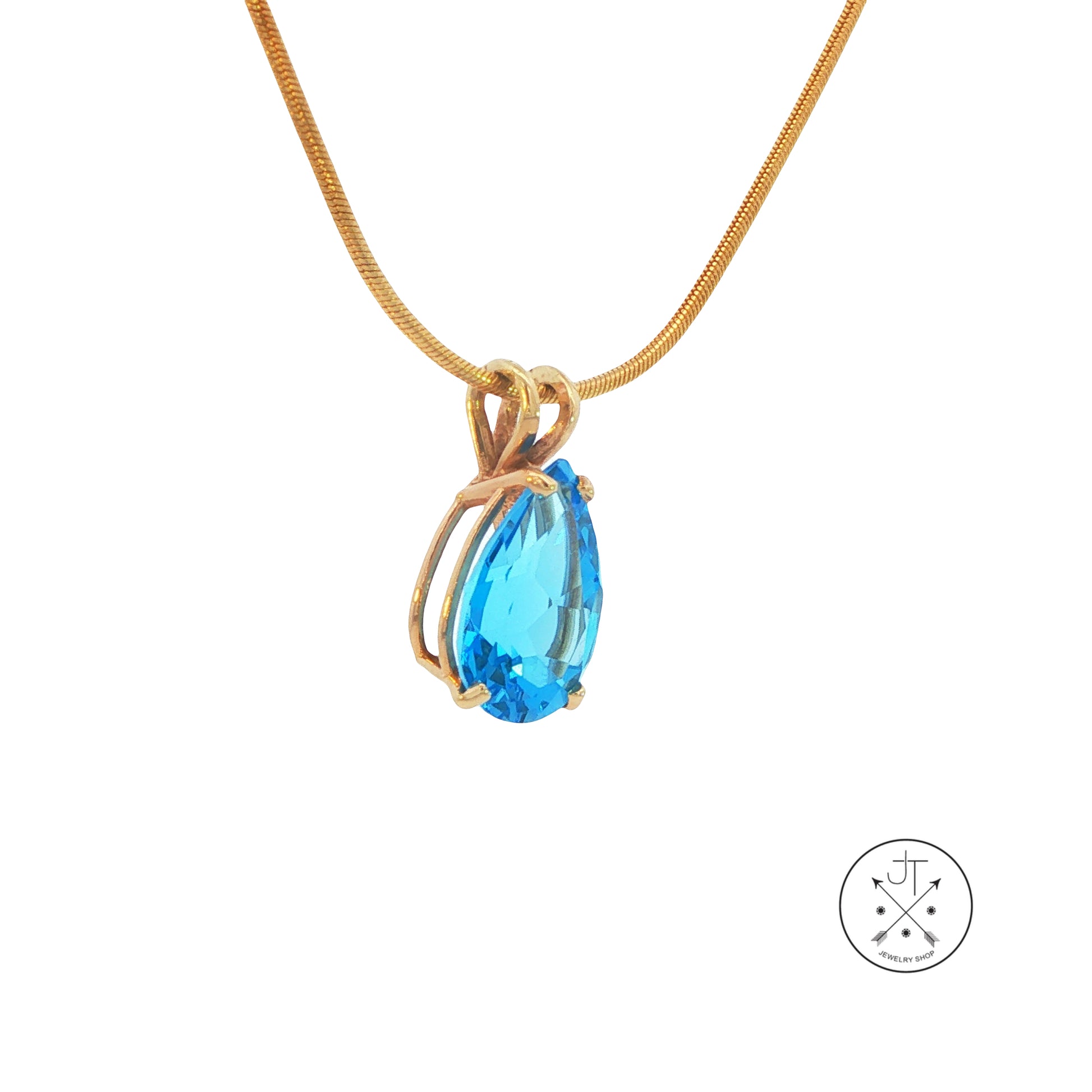 This beautiful vintage pendant necklace would make a classy addition to any outfit. The deep blue 12 x 8 mm pear-faceted natural Topaz is prong-set in a classic drop pendant design for timeless elegance. Stamped '14k italy', the 20-inch-long 1 mm snake chain is secured with a lobster clasp. The pendant is unstamped and has been independently tested as solid 14k Gold. The rabbit ear bale can accommodate up to a 2.8 mm chain. This beautiful necklace weighs approximately 6.07 grams and is in very good condition.