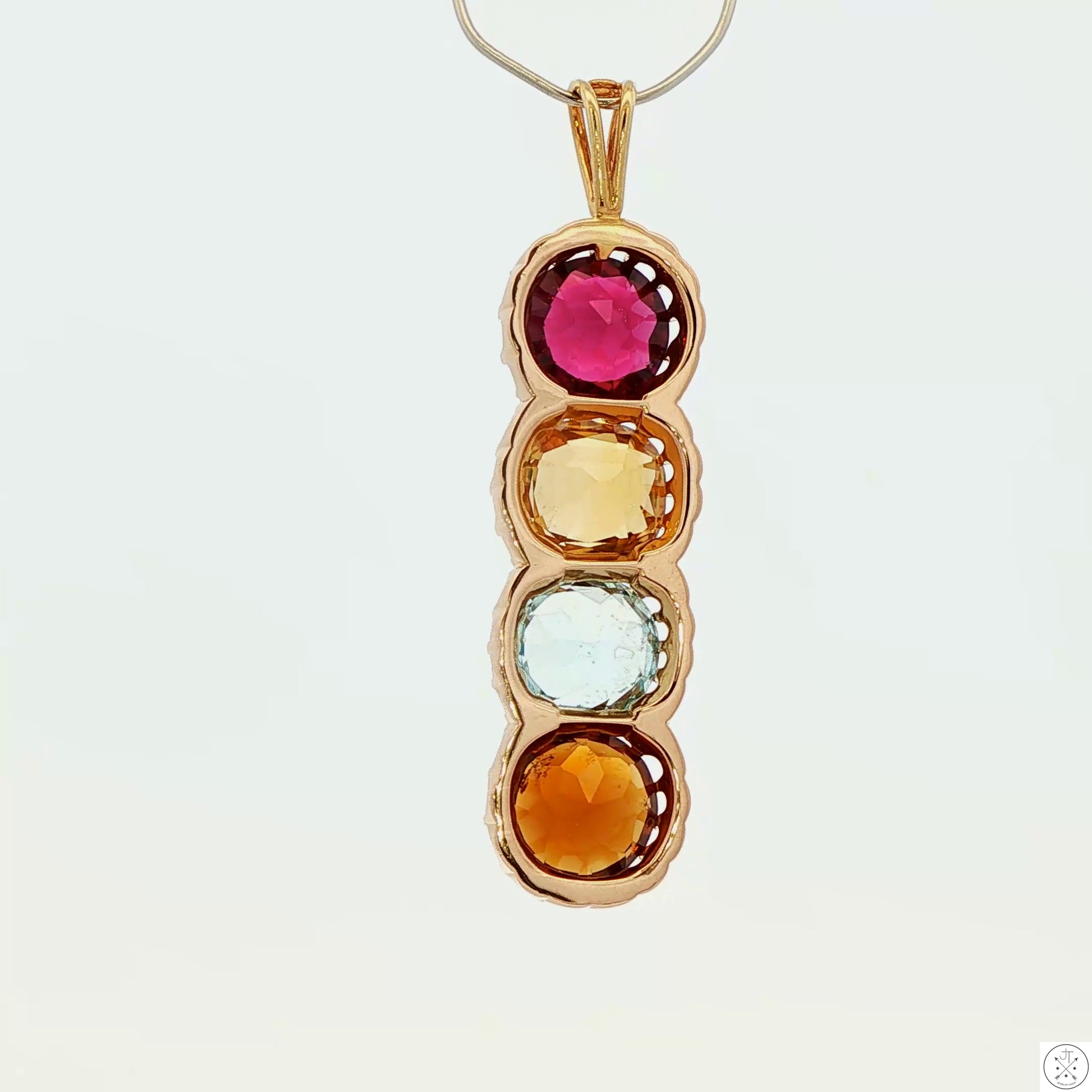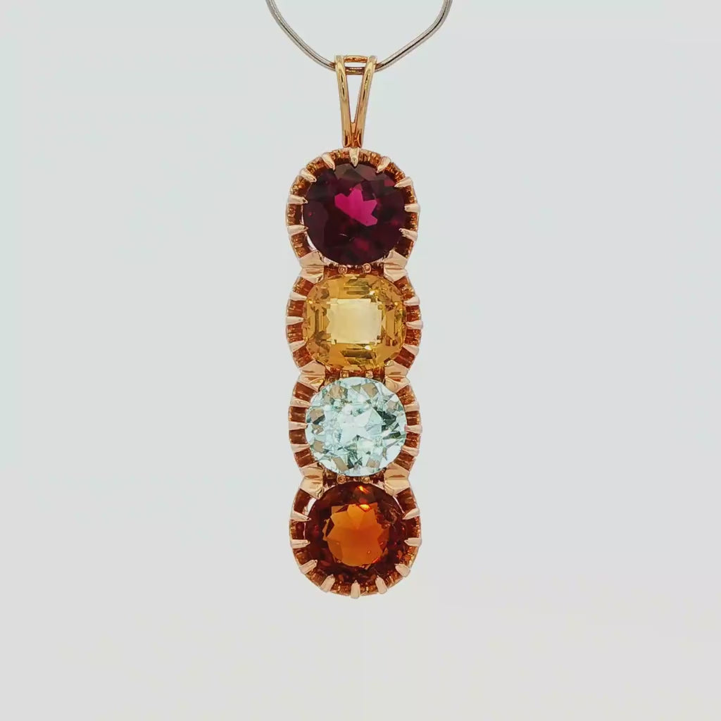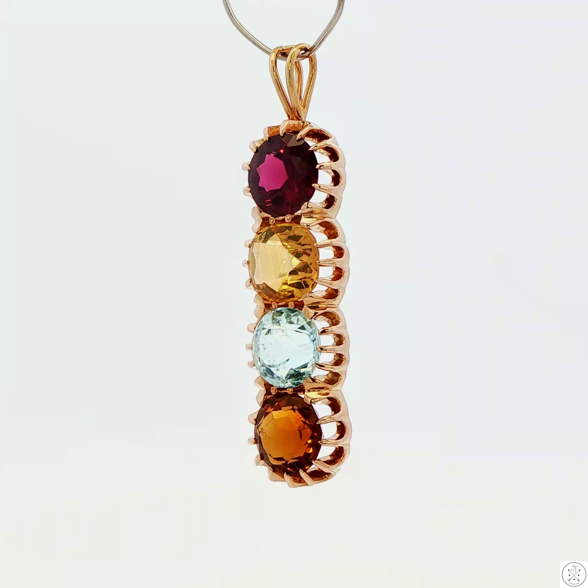 Stunning mid-century solid 14k Yellow Gold pendant with approximately 7.53 ctw of eye-clean round-faceted natural gemstones - Rhodolite Garnet, Aquamarine, and 2 Citrines. This wonderful handmade pendant weighs approximately 7.30 grams and measures approximately 47 mm x 11 mm (1.85 in x .43 in), including the bale, which can fit up to a 3 mm chain, and is in excellent condition despite its age. There are 2 slightly different gold colors here - the gemstones are set in a slightly rose-colored Gold, while the bale is a more modern Yellow Gold, leading us to believe it is a replacement for the original bale, likely to fit a larger chain than the original design. The original bale may have had a maker's and/or purity stamp on it, as there are now none visible. The metal has been independently tested as 14k Gold.