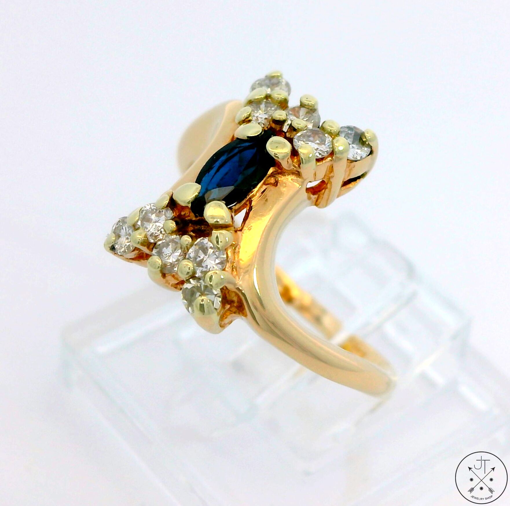 A masterpiece of jewelry design, this vintage 14k Gold ring boasts a central Marquise Sapphire, accentuated by a halo of 10 brilliant I-color SI1-clarity round Diamonds. Its graceful curves and luxurious finish make it a standout piece, perfect for adding a touch of glamour to any outfit. Stamped '14kf', this wonderful size 5.5 ring is in excellent condition for its age. The top of the ring is 13.3 mm at its widest, with a unique 1.5 mm bypass-style band.