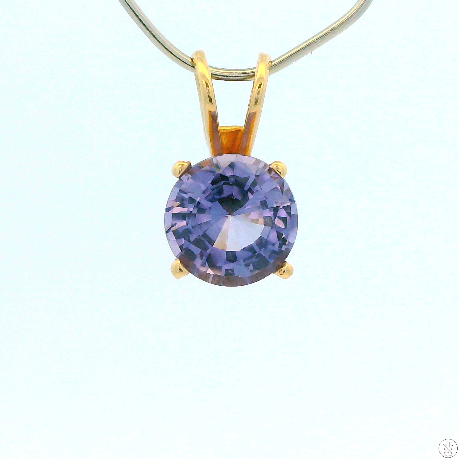 This stunning vintage pendant showcases a wonderful 1.64-carat eye-clean light purple round-faceted natural Spinel, mined in Burma (Myanmar), that captures the light beautifully. Crafted with precision, it features a luxurious solid 14k Yellow Gold setting that enhances its elegance. Perfect for adding a touch of sophistication to any outfit, this pendant is a must-have for jewelry or gemstone lovers. Stamped '14k', this classically simple small pendant measures approximately 12.7 mm x 7.3 mm including the rabbit ear bale, which can accommodate up to a 2 mm chain, weighs .86 grams, and is in excellent condition.