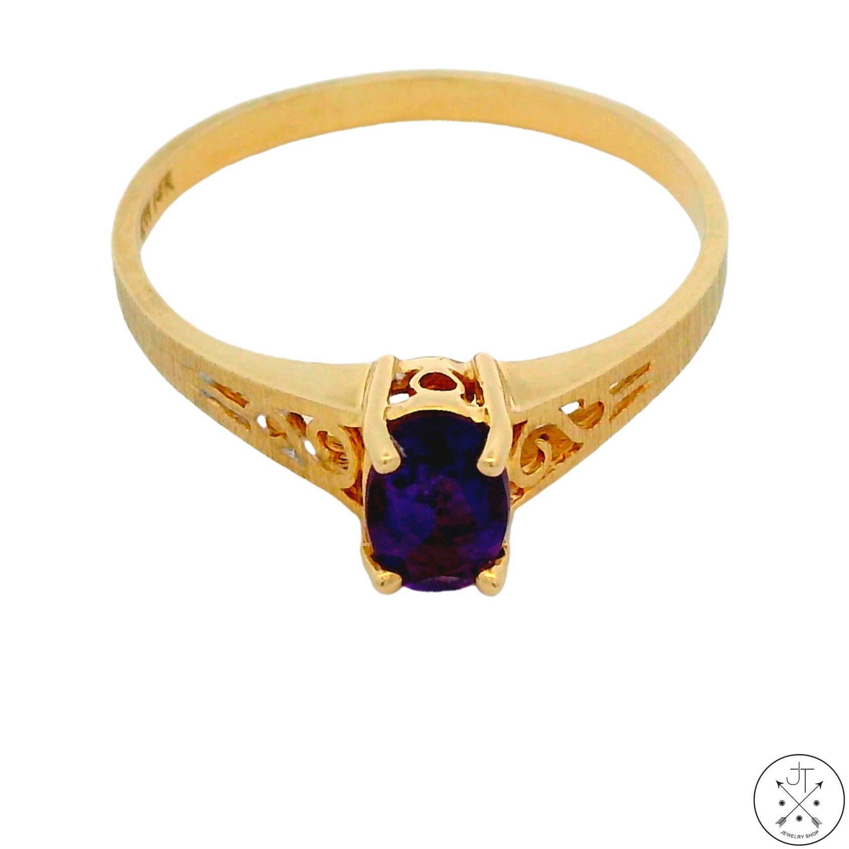 This exquisite, solid 14k yellow Gold ring features a stunning 1/3 carat natural Amethyst gemstone, elegantly set in a delicate band. The intricate design of the band adds a touch of sophistication, making it perfect for both everyday wear and special occasions. Stamped with a maker's mark and '14k', this wonderful size 6.5 ring weighs approximately 1.47 grams and is in very good condition.
