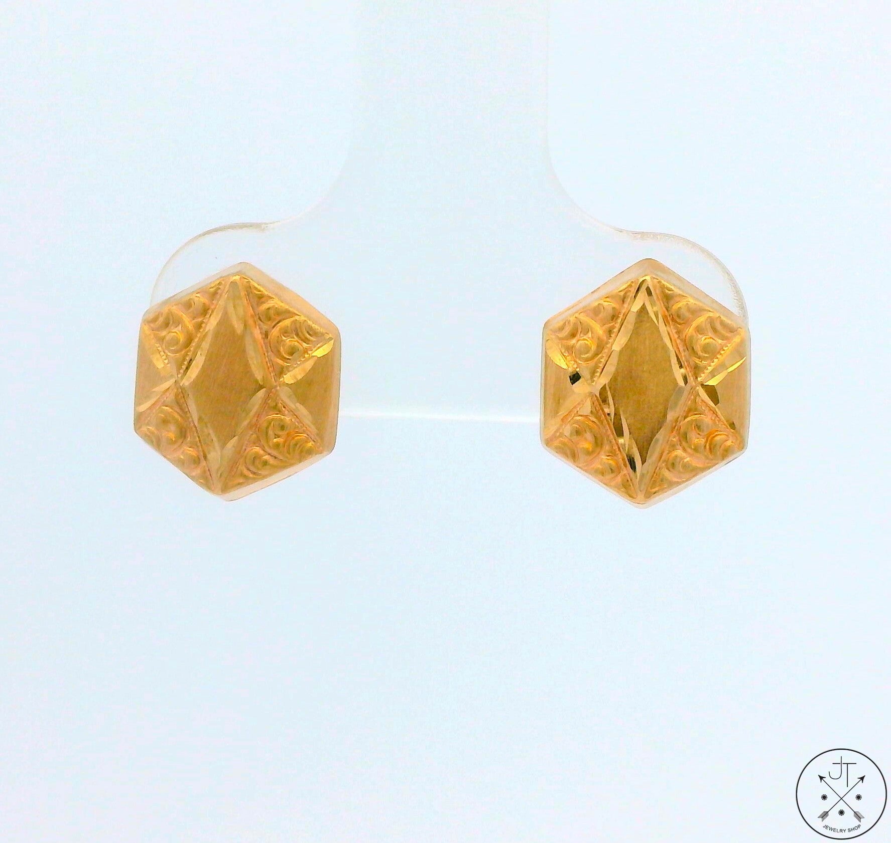 Add a touch of luxury to your accessory collection with these exquisite, solid 14k Yellow Gold 9 mm hexagonal earrings. The detailed engraving and contemporary shape make them a standout piece, perfect for enhancing your everyday style or complementing a special outfit. These vintage earrings feature butterfly friction backs for comfortable wear.