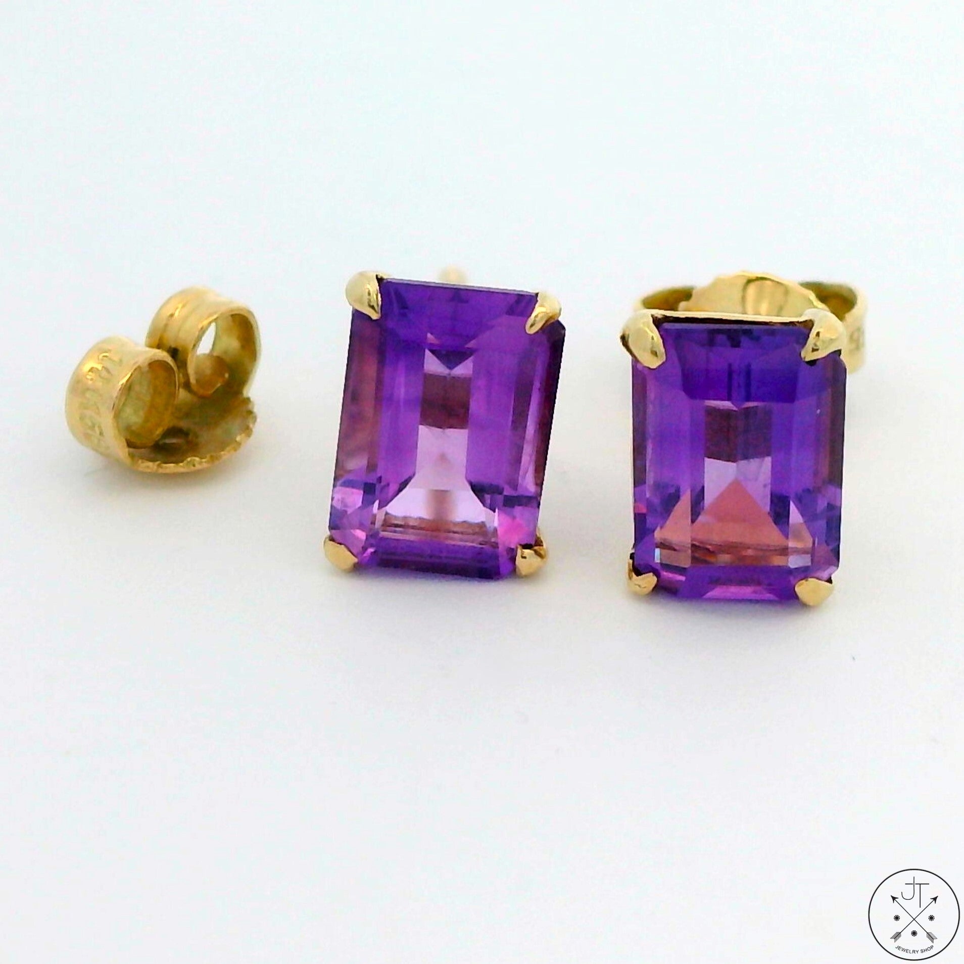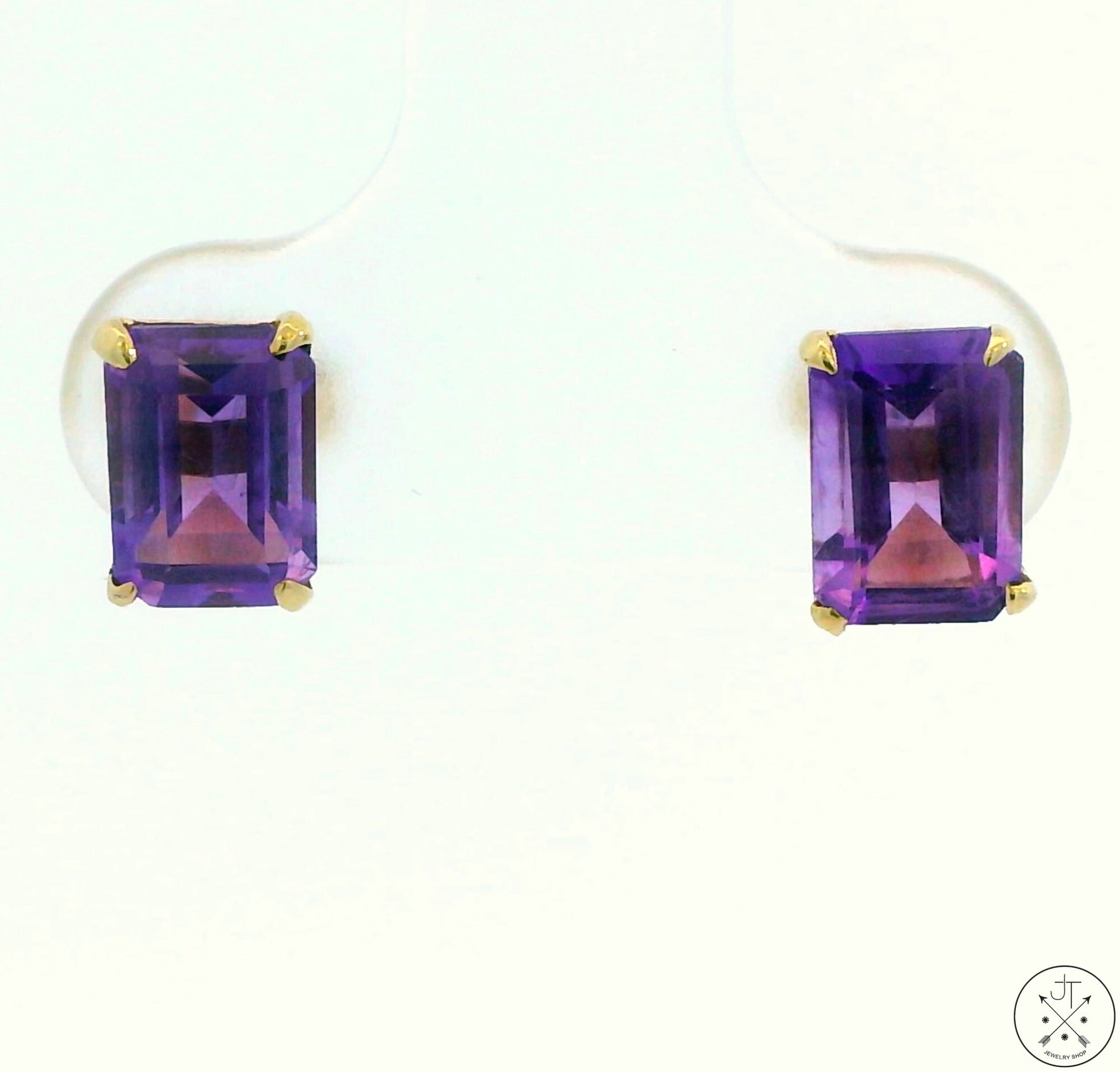 Discover the beauty of simplicity with these solid 14k Yellow Gold stud earrings with approximately 2.00 ctw of rectangular step-cut natural Amethyst gemstones. Their classic design and vibrant color make them a versatile choice for any jewelry lover. Ideal for gifting or treating yourself, these earrings embody elegance and sophistication, ensuring you shine on every occasion. Stamped '14k 585' (58.5% pure gold = 14k) on the butterfly backs, these 1990s earrings are in excellent condition with very little wear and tight backs. The front of the prong settings measures approximately 7.3 mm x 5.3 mm.