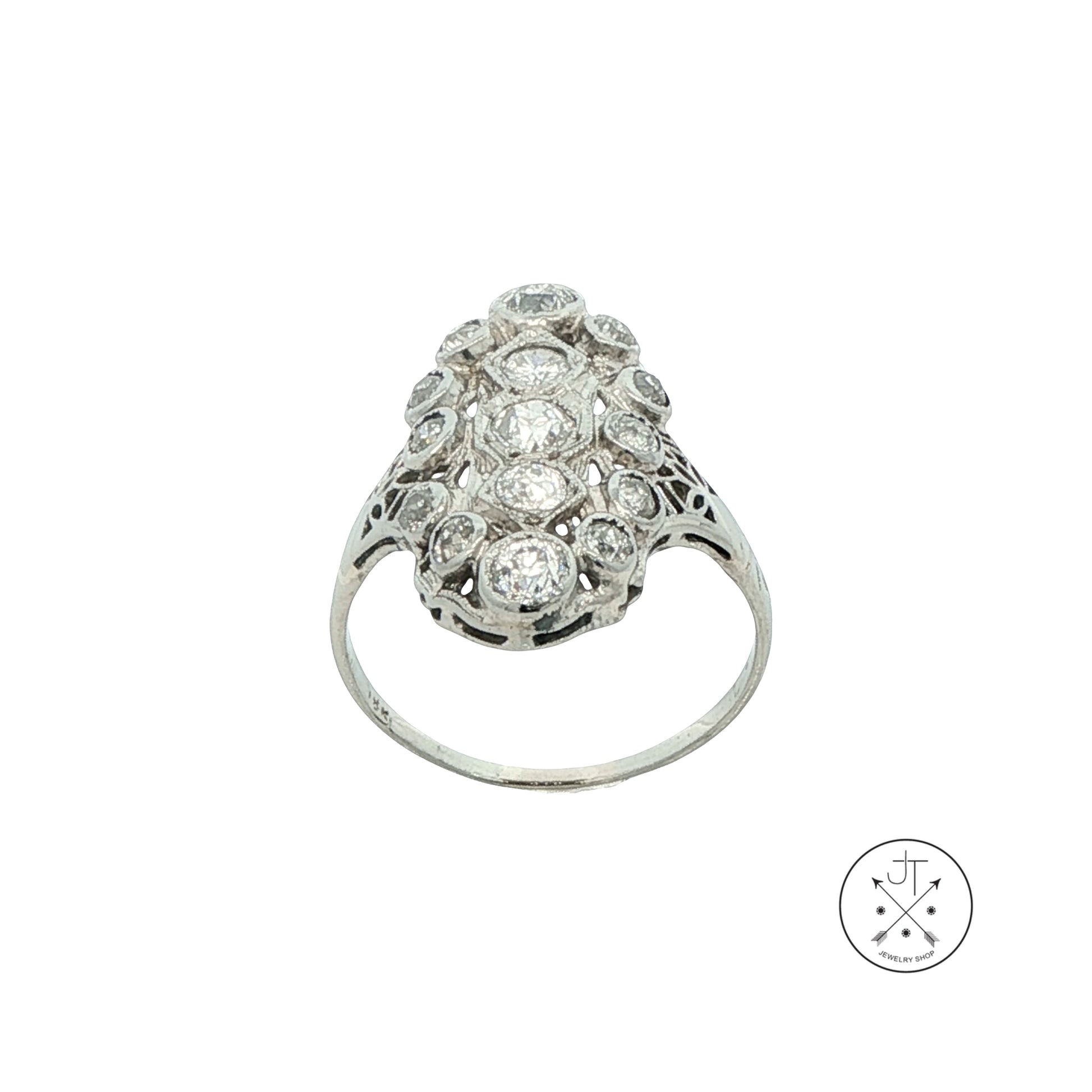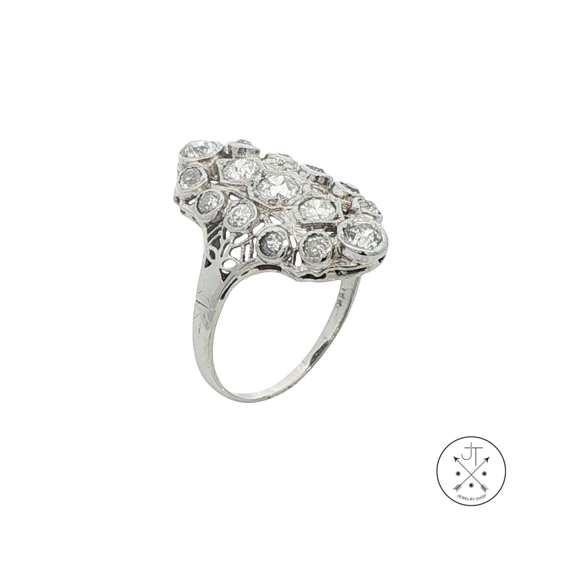 Gorgeous mid-century solid 18k White Gold ring with 15 beautiful old-cut natural Diamonds averaging approximately H-color and SI1-clarity. Stamped '18kt', this wonderful size 7.5 vintage ring is in very good condition for its age and weighs approximately 3.58 grams. The elongated top of the ring is approximately 22.5 mm, over a thin band that tapers to under 1.3 mm at the bottom. This vintage ring was inspired by antique filigree-styled designs, with a lower profile that is easier to wear and more Gold weight for strength.