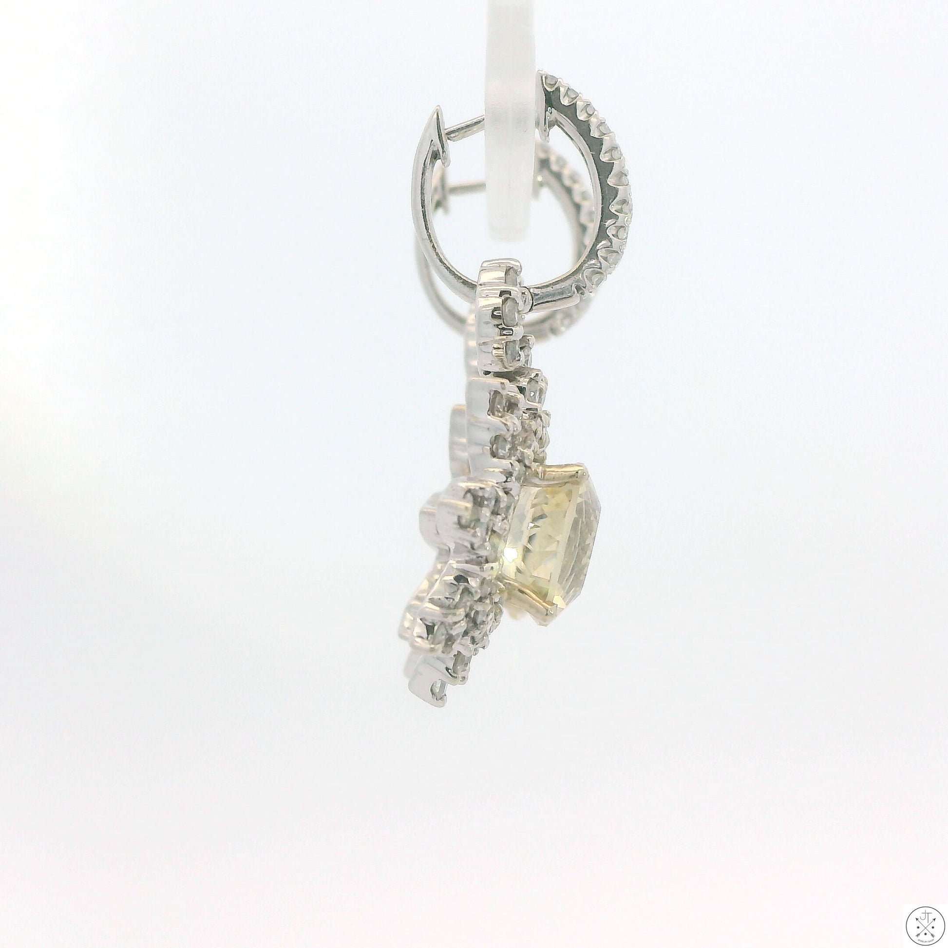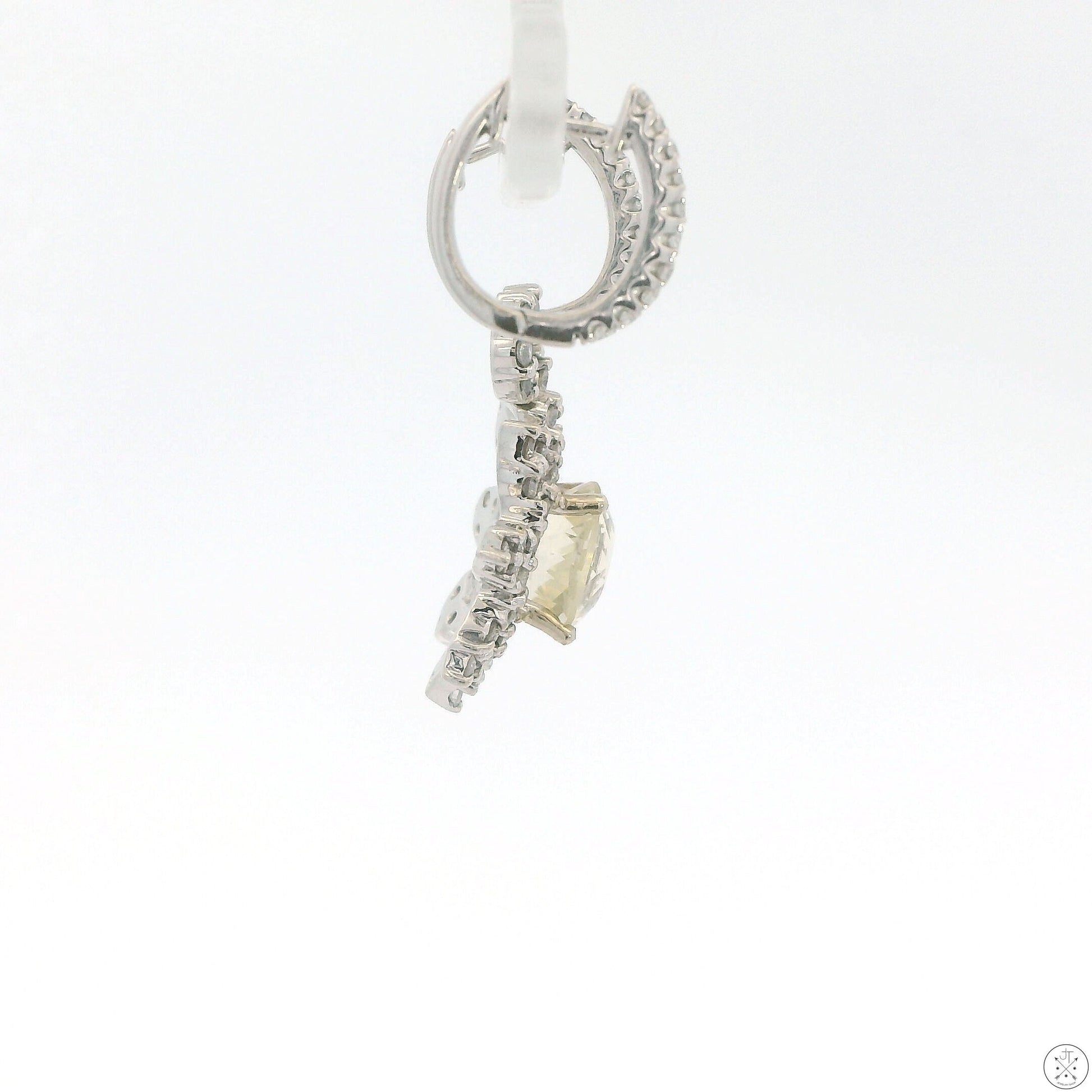Dazzling dangle earrings crafted in lustrous solid 18k White Gold, showcasing 3.92 ctw of rare round-faceted natural Bytownite gemstones accented by 132 (approximately 1.25 ctw) of sparkling natural Diamonds averaging approximately H-color and VS2-clarity. The 8 mm Bytownites exude a captivating yellow hue, adding a touch of noontime sun-like warmth and elegance to these exquisite earrings. Stamped with a maker's mark on the back of the suns and '18k' inside the hoops, these vintage earrings weigh approximately 9.36 grams together and are in very good condition. The small 11.7 mm tall huggie-style hoops can be removed, creating a design that is easily convertible between subtle and showtime. Worn completed, the earrings measure approximately 29 mm tall and 19 mm wide.