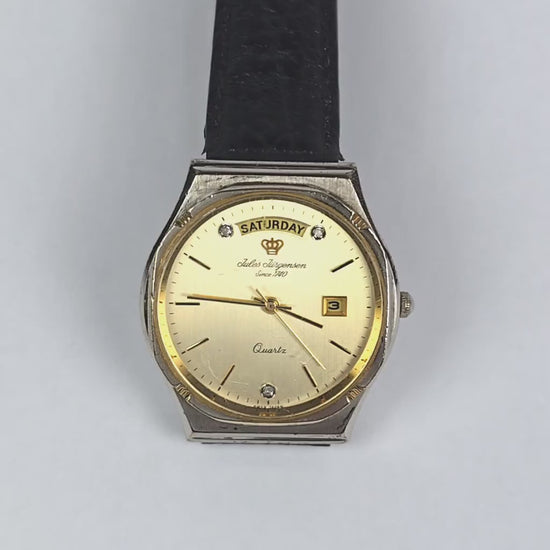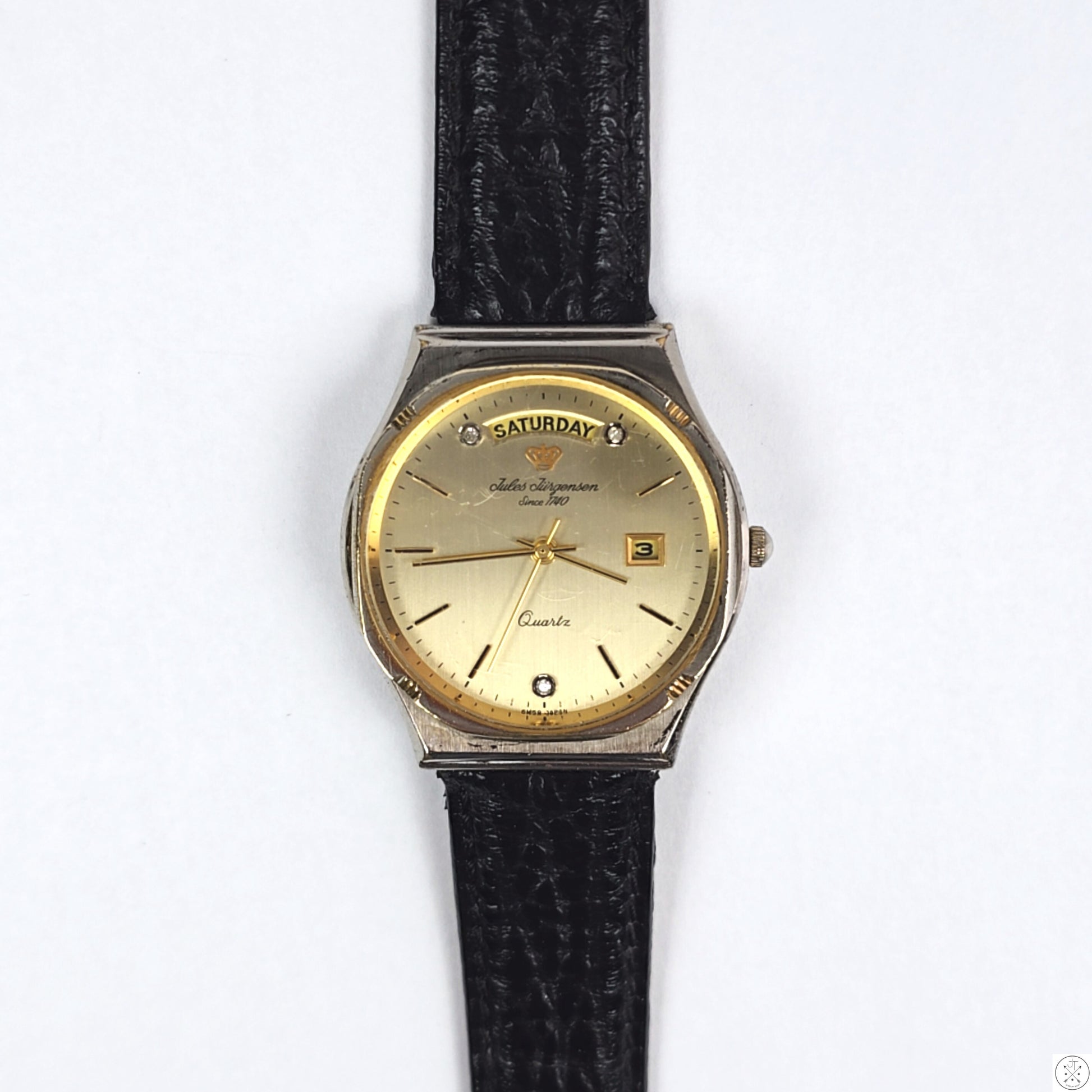 Vintage 34 mm Jules Jurgensen 6M59 Day Date Quartz Watch Diamond Markers