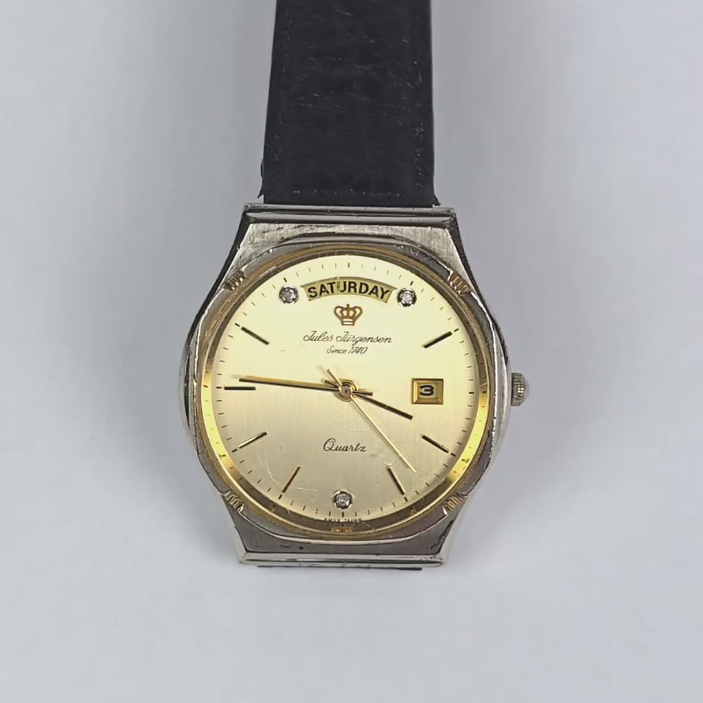 Jules Jurgensen Quartz wristwatch from the 1990s. This vintage 34 mm watch with 18 mm lugs features gold-toned dial with gold hour markers, hands, and date surround, as well as a fading color gold-toned bezel. The Japan quartz movement has a new battery installed and keeps accurate time, and powers the day and date functions. There are three .01 carat natural Diamond markers - at the 1,6, and 11 o'clock positions. Fits up to an 8 inch wrist on the high-quality IW shark skin/calf strap with gold-toned buckle.