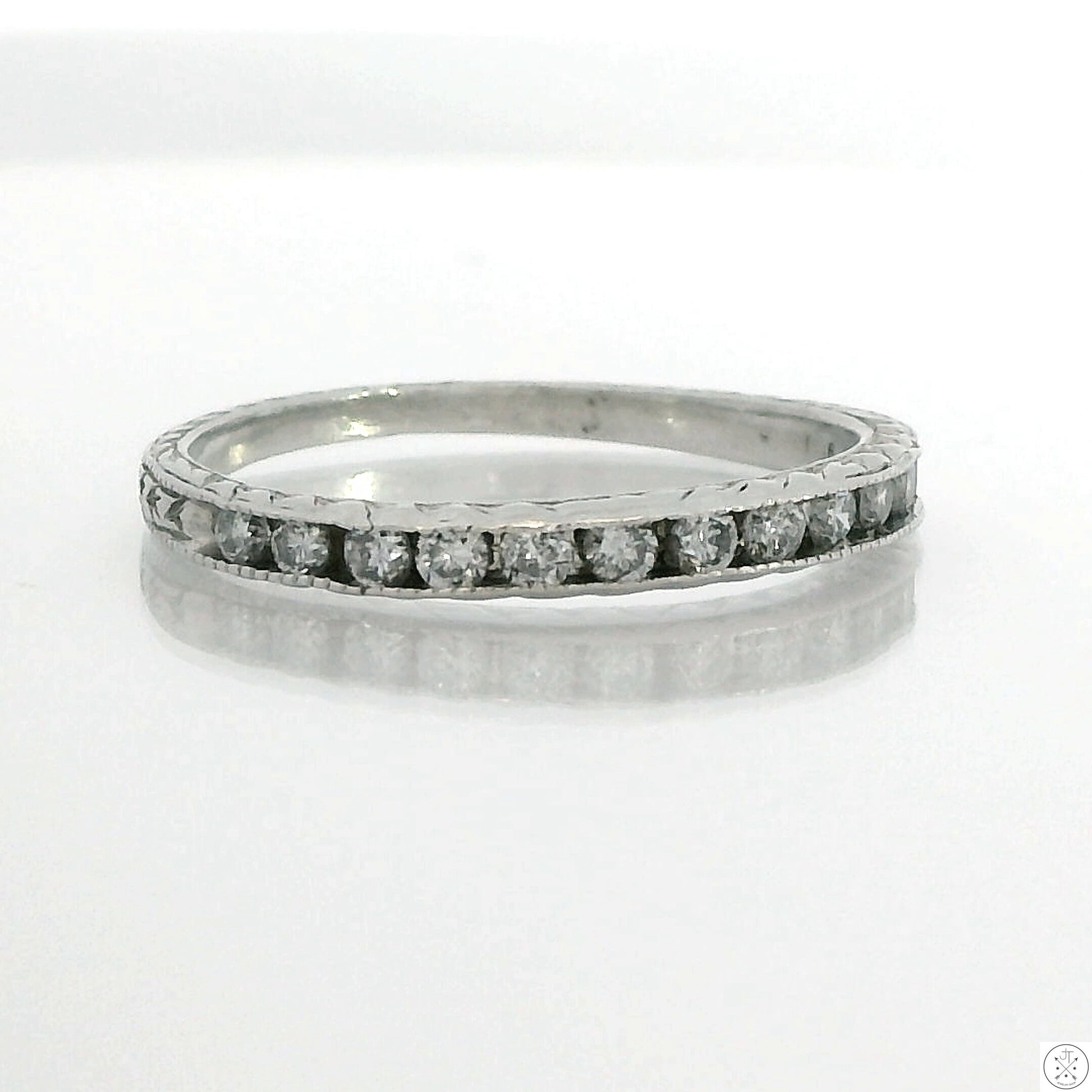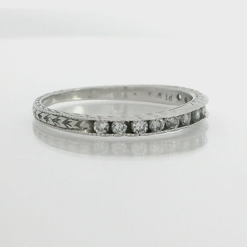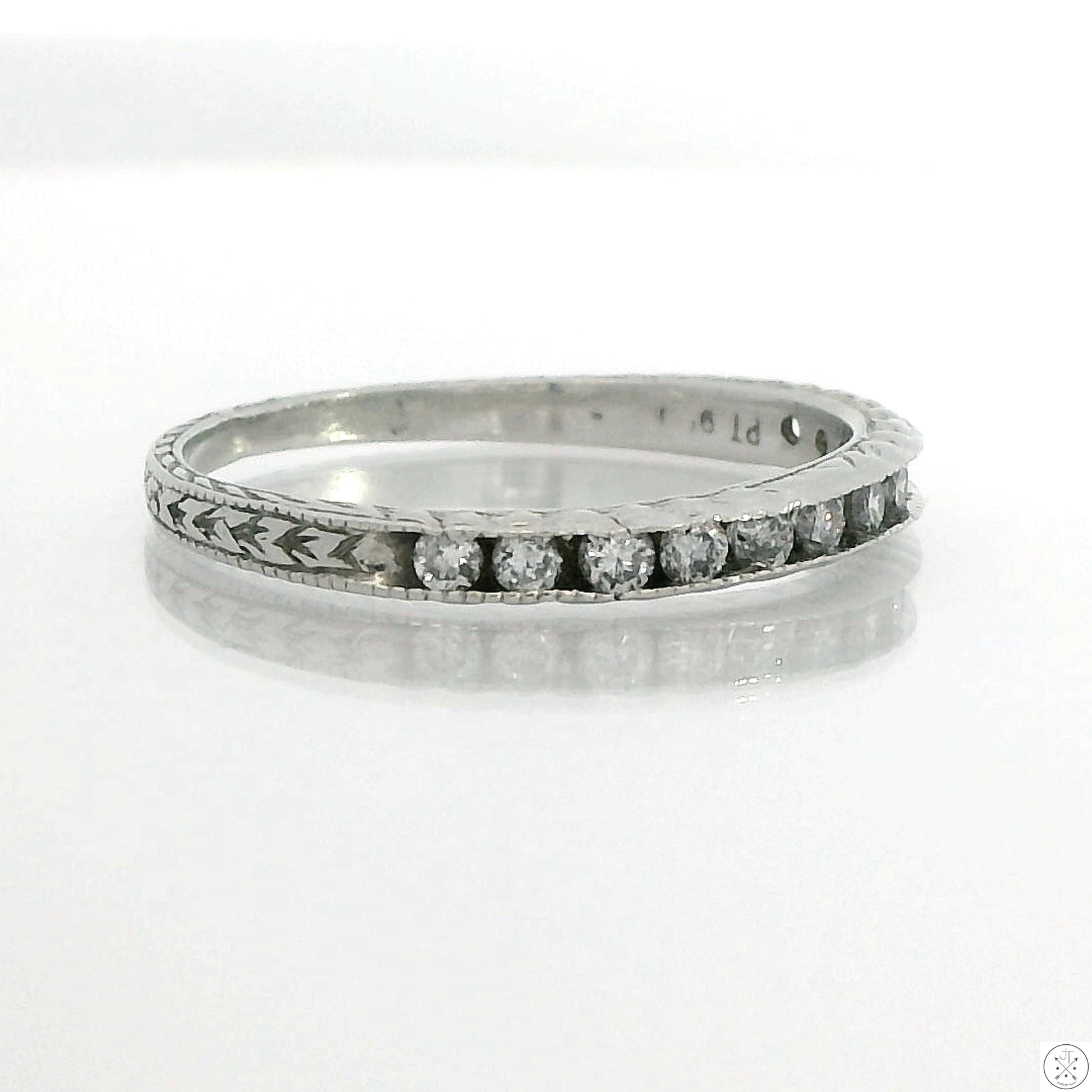 Elevate your jewelry collection with this exquisite 950 Platinum band showcasing a beautiful arrangement of approximately .36 ctw of channel-set round-faceted natural Diamonds averaging approximately H-color and SI2-clarity. The intricate detailing around the band ensures that this ring will catch the eye and complement your style effortlessly. Stamped 'PT 950', this classy, circa 1960s-1970s size 6 band weighs approximately 2.05 grams and is in very good condition for its age. The top of the band measures approximately 2.30 mm at its widest, tapering to 1.38 mm at the bottom.