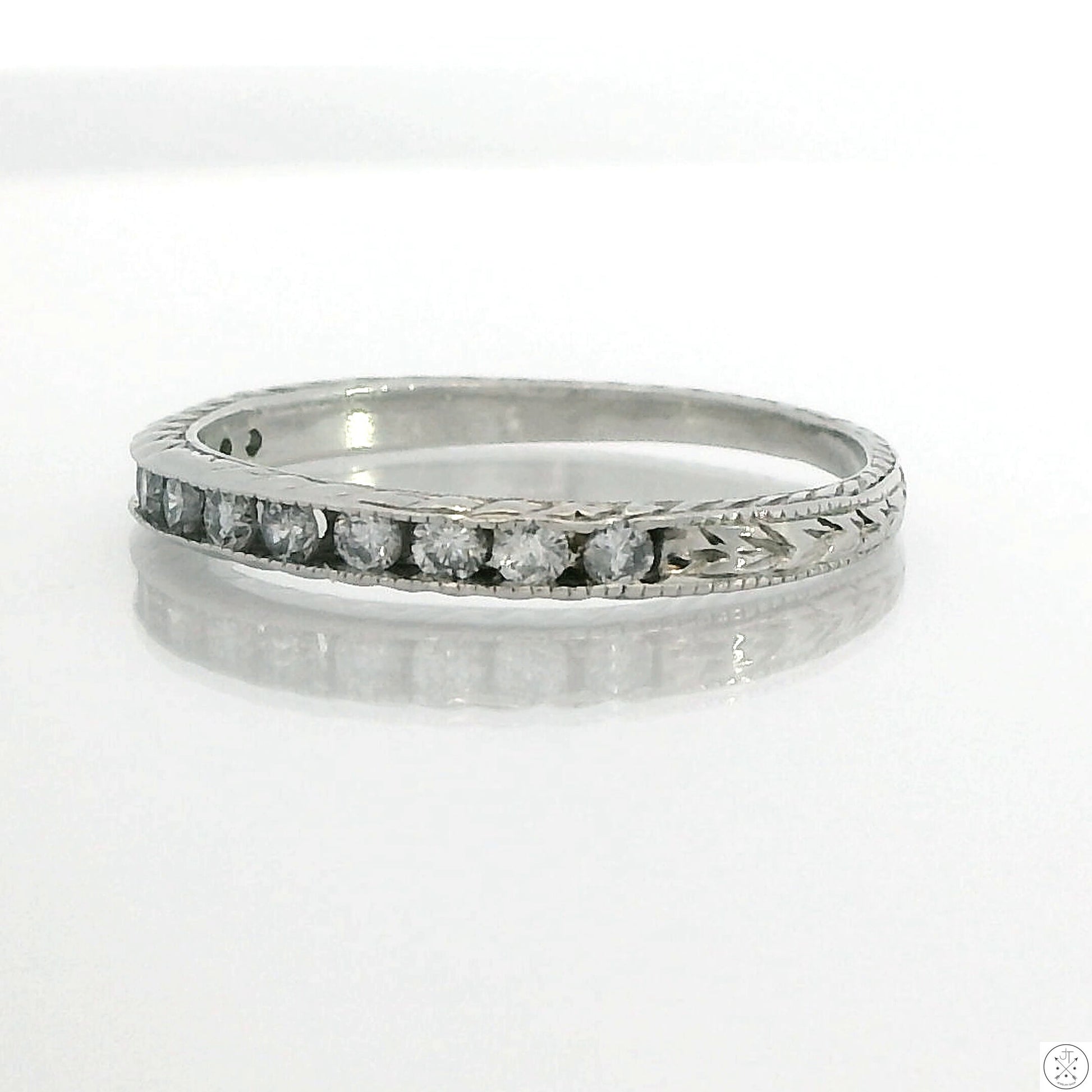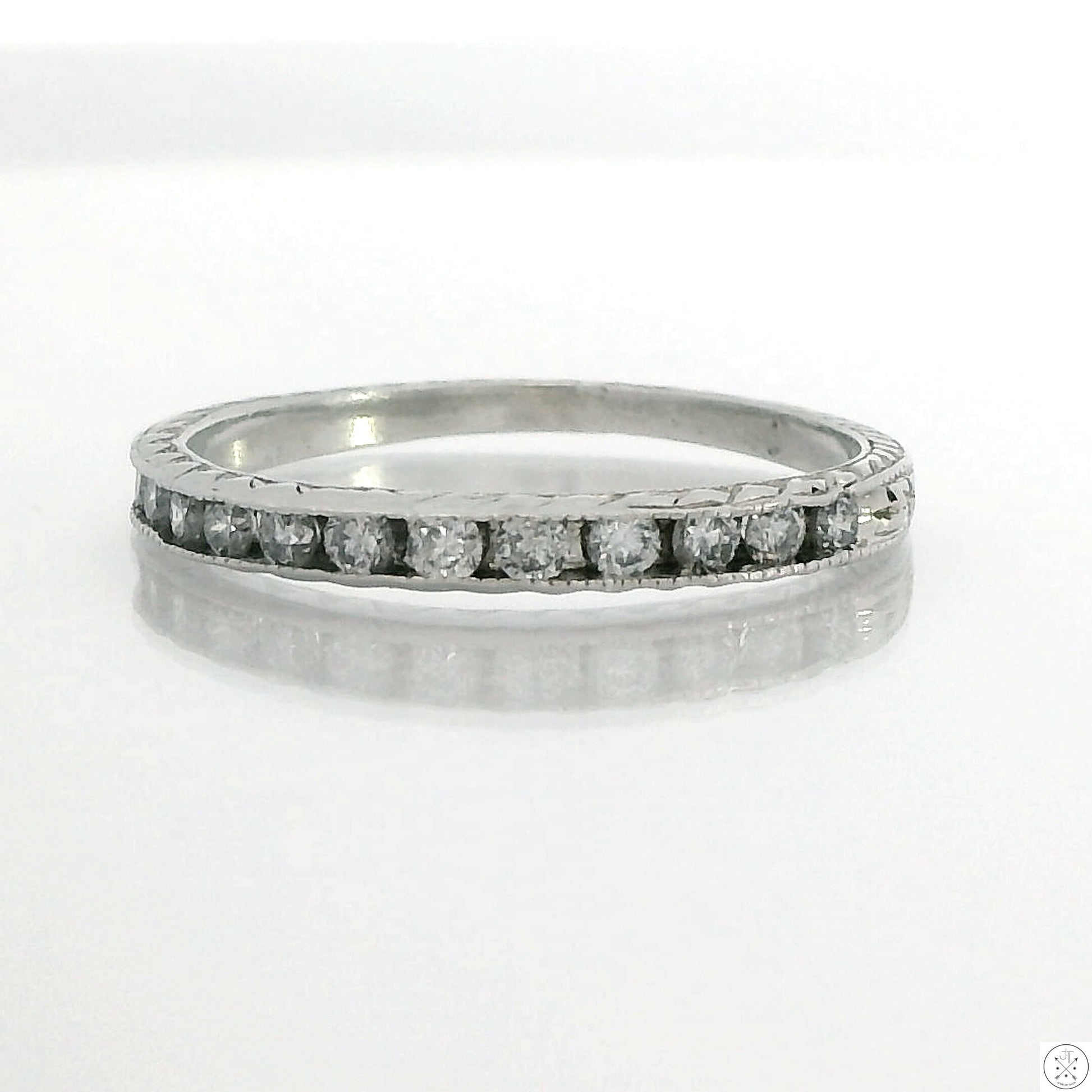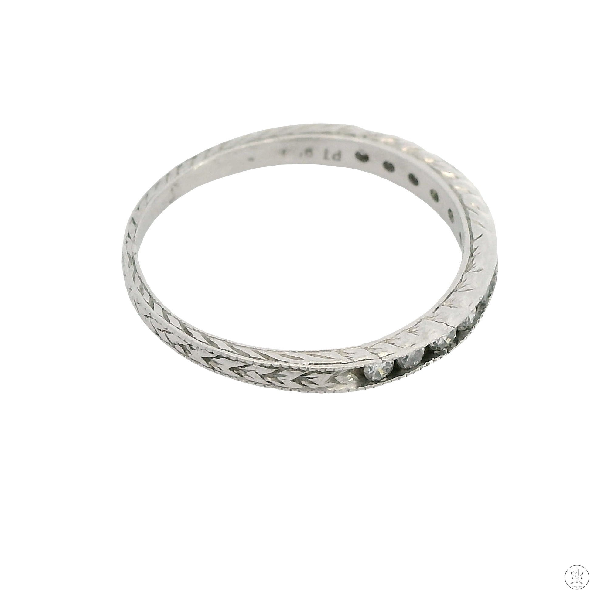 Elevate your jewelry collection with this exquisite 950 Platinum band showcasing a beautiful arrangement of approximately .36 ctw of channel-set round-faceted natural Diamonds averaging approximately H-color and SI2-clarity. The intricate detailing around the band ensures that this ring will catch the eye and complement your style effortlessly. Stamped 'PT 950', this classy, circa 1960s-1970s size 6 band weighs approximately 2.05 grams and is in very good condition for its age. The top of the band measures approximately 2.30 mm at its widest, tapering to 1.38 mm at the bottom.