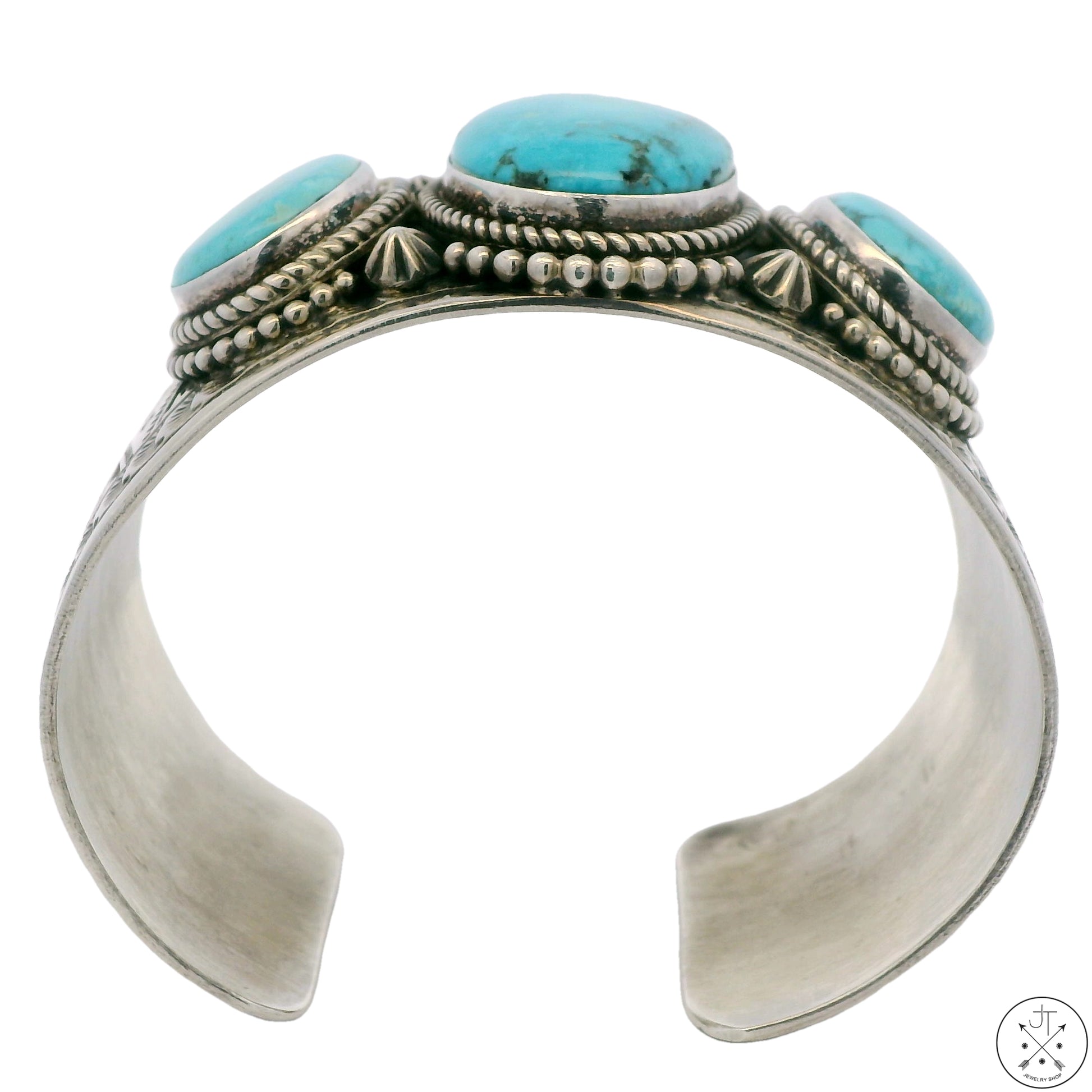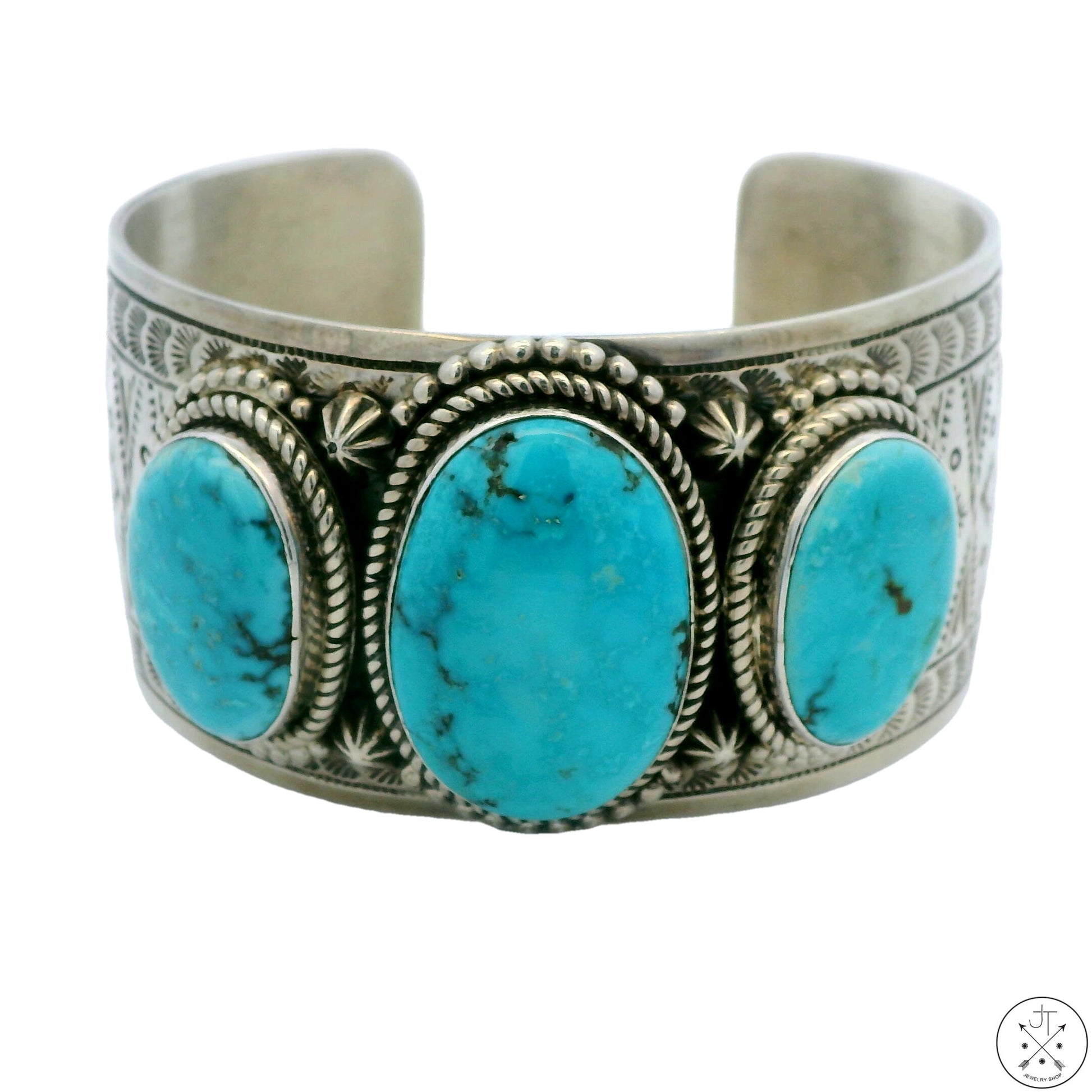 Stunning vintage Sterling Silver cuff with 3 large natural Turquoise Cabochons from the Bisbee mine. Stamped with a maker's mark and 'sterling' by Navajo Silversmith Joe Piaso Jr., this classy cuff has been cleaned but not polished, weighs approximately 115.09 grams, and is in excellent condition. The 38 mm (1.5 in) wide cuff has inner dimensions of approximately 68 mm (2.7 in) wide and 53 mm (2 in) tall, creating an inner circumference of approximately 192 mm (7.5 in), Ladies size 2XL or Mens size L, easily (professionally) sized up a bit if needed.