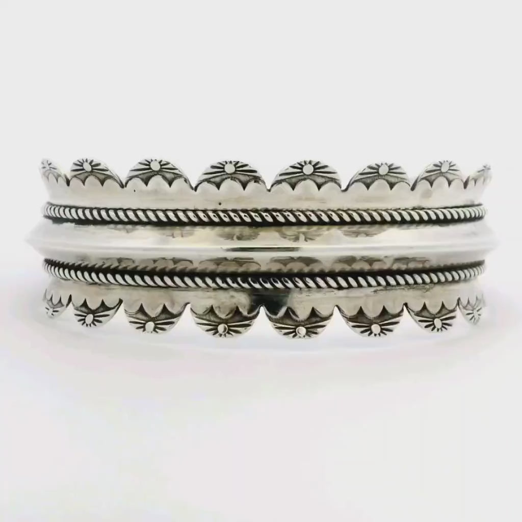 Beautiful vintage Sterling Silver cuff with unique flared edges and a carinated center. Stamped 'D.Troutman' and 'sterling' by the Navajo Silversmith David Troutman, this classy 1980s cuff has been cleaned but not polished, weighs approximately 52.62 grams, and is in excellent condition. The top of the bracelet is approximately 21.7 mm wide and tapers to 13 mm at the bottom, with inner dimensions of 59 mm (2.3 in) wide and 47 mm (1.8 in) tall with a 28 mm (1.1 in) gap, creating an inner circumference of approximately 171 mm (6.7 in), Ladies size L or Mens size S.
