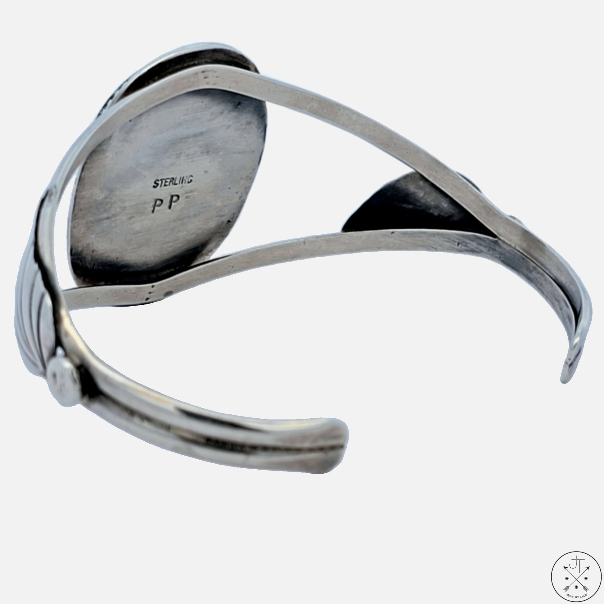 Beautiful vintage Sterling Silver cuff with a natural 'New Lander' Chalcosiderite Turquoise cabochon with pale blues, hints of yellow, and grey spider-webbing. Stamped 'PP' and 'sterling' by Navajo Silversmith Patricia Platero, this classy cuff has been cleaned but not polished and is in excellent condition. The top of the bracelet is approximately 35 mm at its widest, tapering to a 6.7 mm flare at the 30 mm (1.2 in) gap with inner dimensions of 60 mm (2.3 in) wide and 43 mm (1.7 in) tall, creating an inner circumference of approximately 170 mm (6.7 in), Ladies size L or Men's size S.