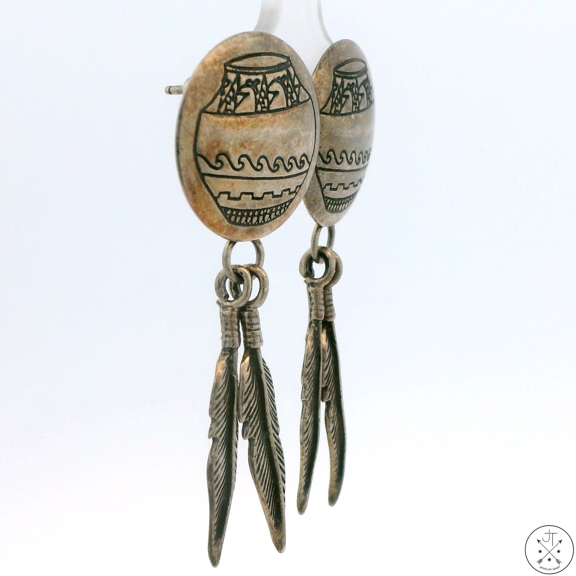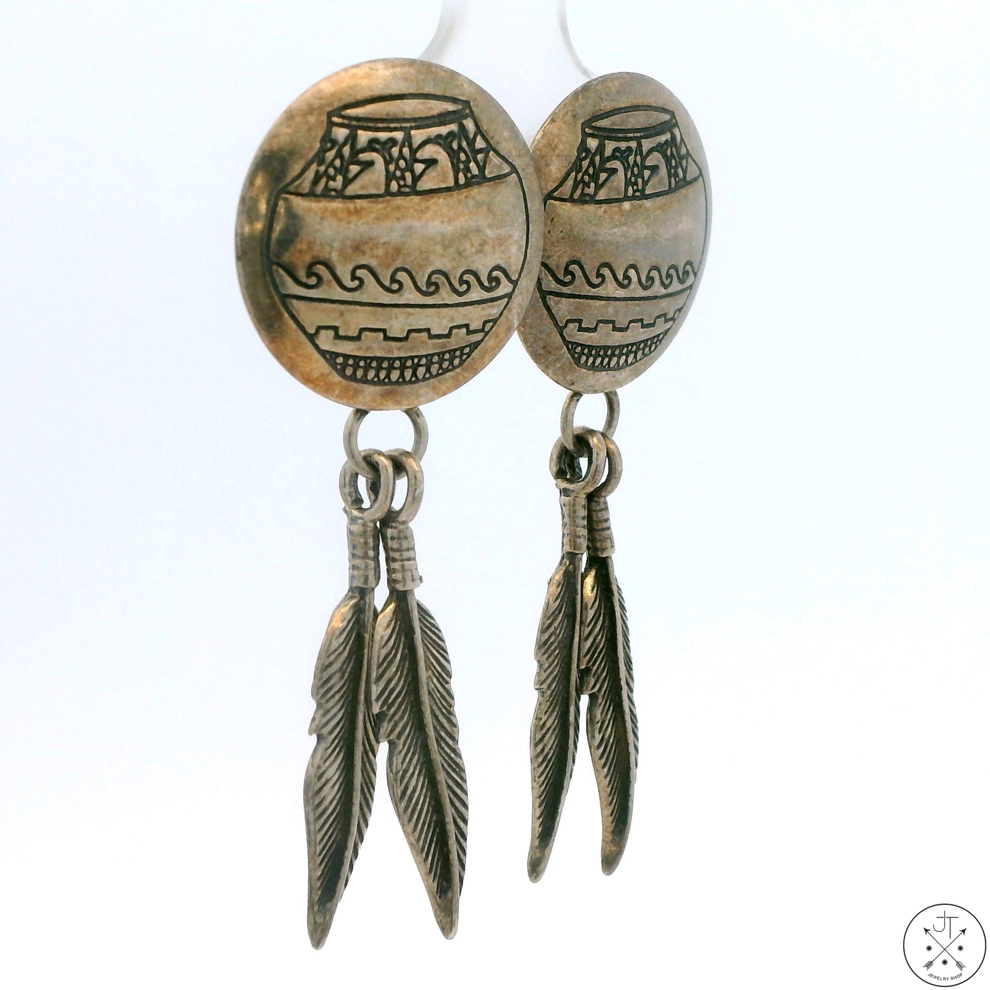 Vintage Navajo Sterling Silver Dangle Earrings Stud Post Concho Feathers Vase Signed