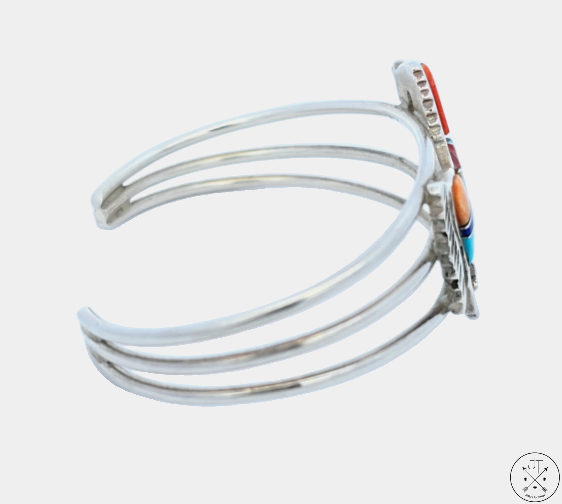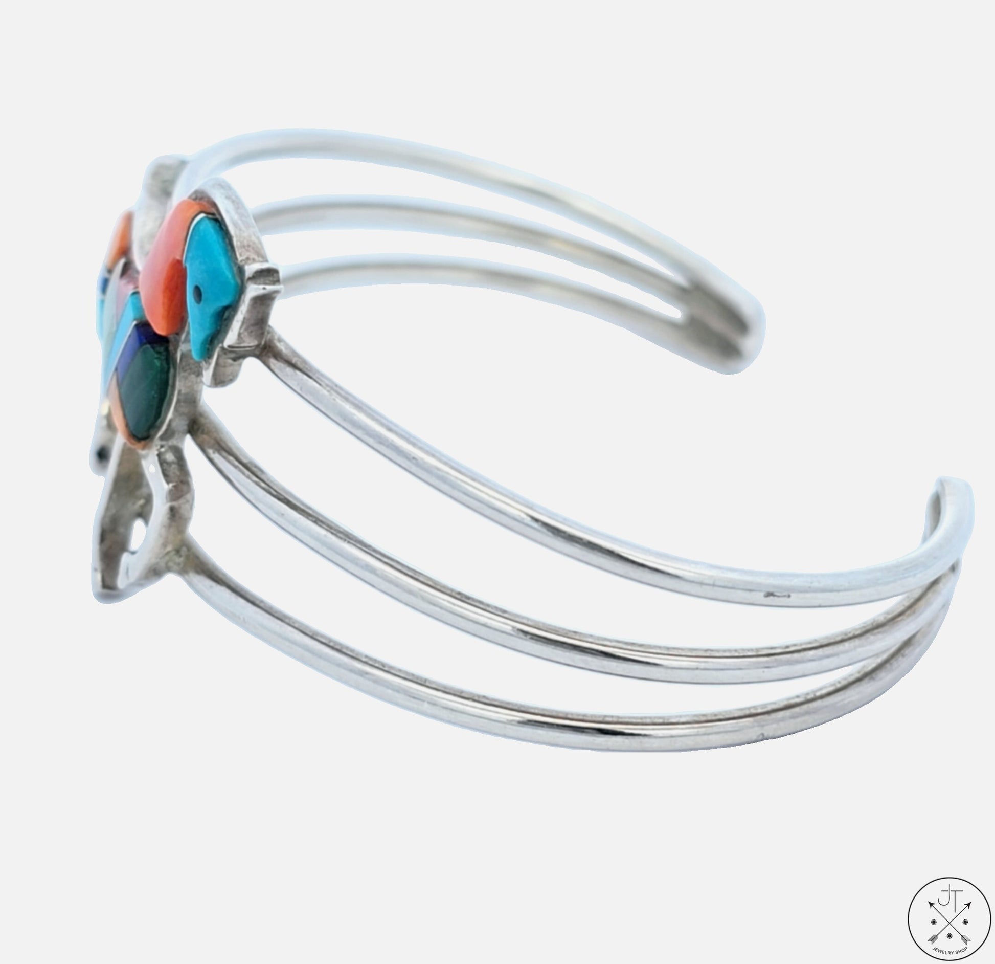 Beautiful vintage Sterling Silver cuff with a 34 mm x 28 mm prancing Horse set with a mosaic of natural Turquoise, Spiny Oyster shell, Gaspeite, Malachite, and Lapis Lazuli. Stamped with a partially covered maker's mark and 'sterling', this wonderful cuff has been cleaned but not polished and is in excellent condition. The inside of the bracelet measures approximately 61 mm (2.4 in) wide and 44 mm (1.7 in) tall, with a gap of 28 mm (1.1 in), creating an inner circumference of approximately 170 mm (6.6 in), Ladies size L or Mens size S.