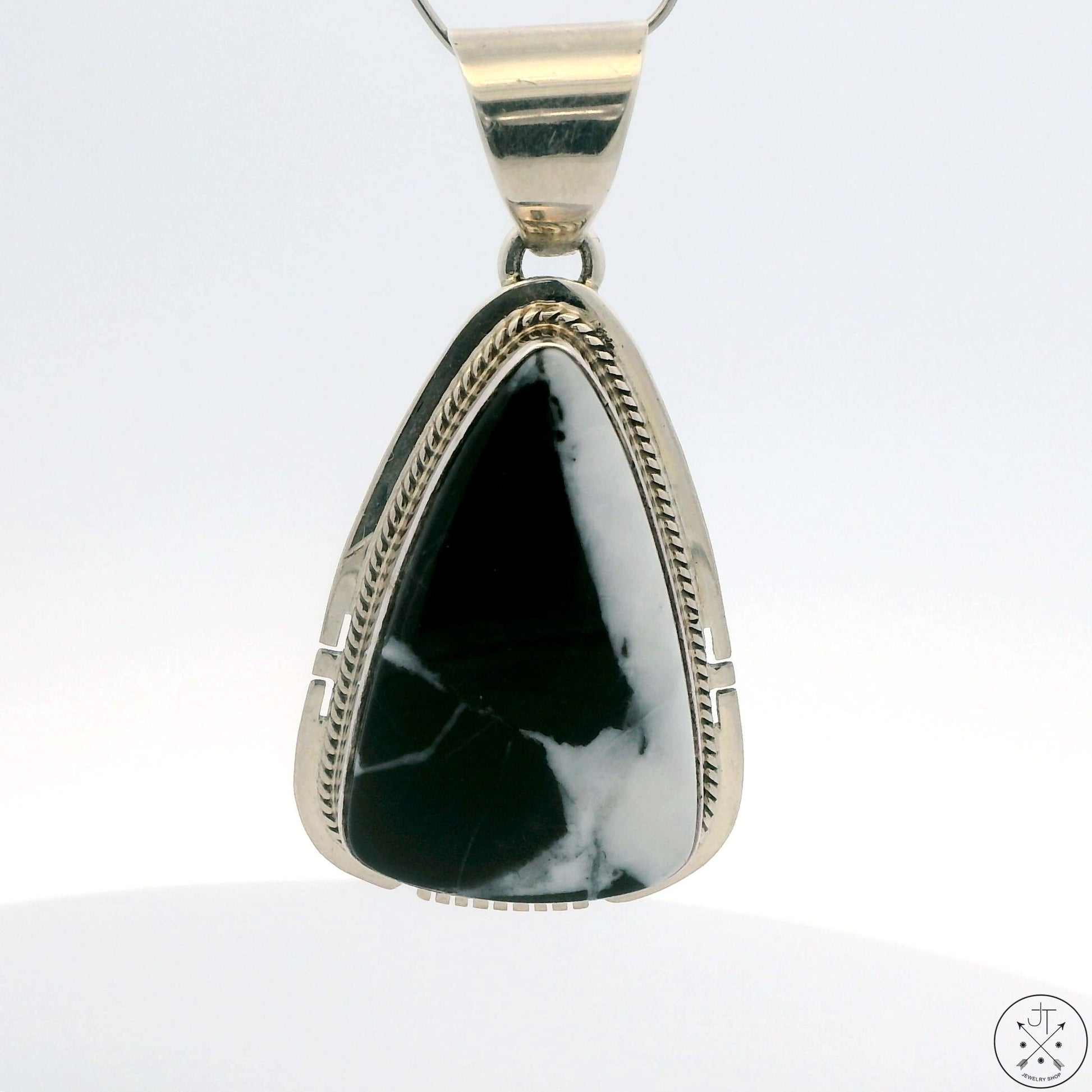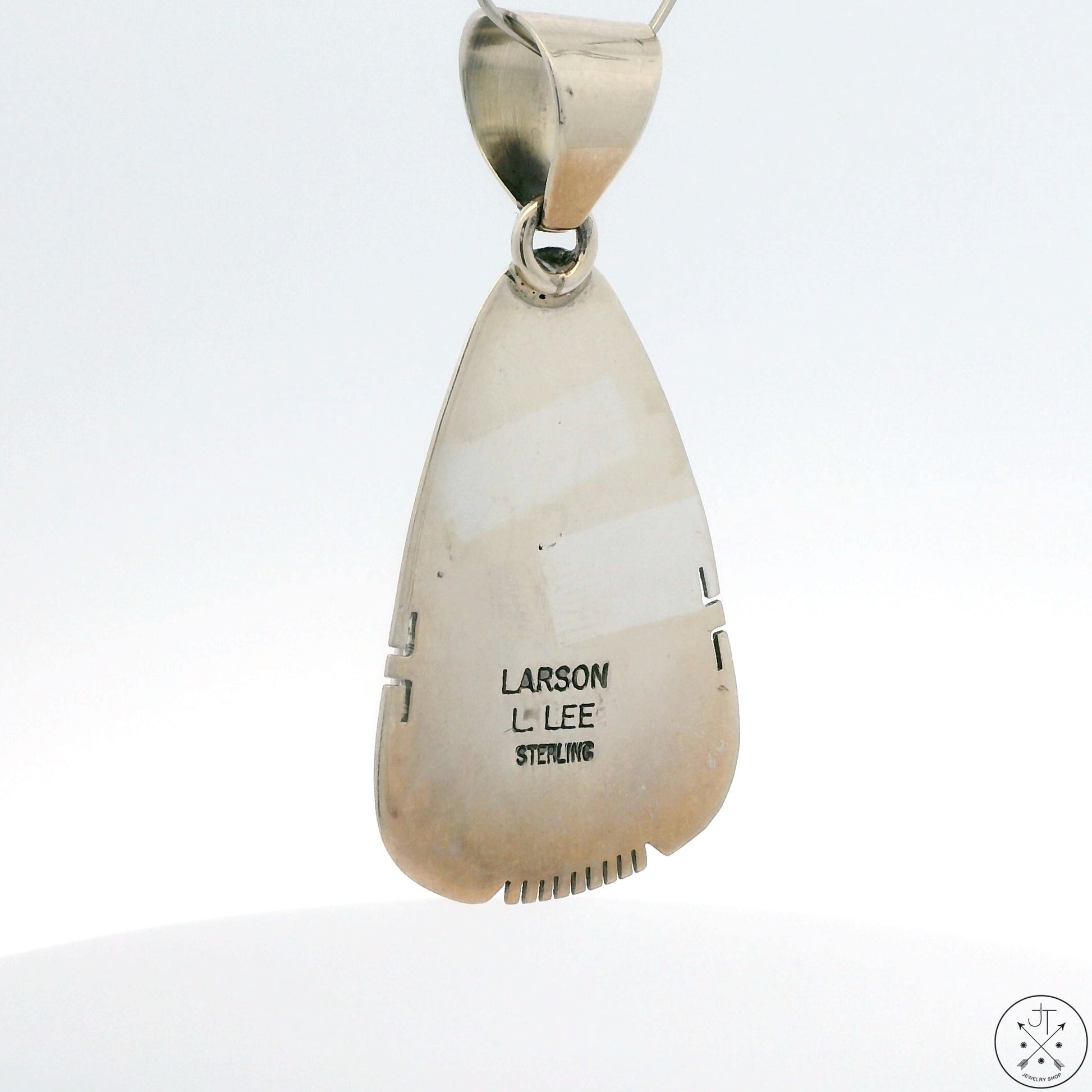 This stunning Sterling Silver pendant features a striking little-known black and white natural gemstone called 'White Lightning', elegantly set in a polished silver frame. Its unique design captures the eye, making it a perfect accessory for both casual and formal occasions. Wear it to express your individuality and style. Stamped 'larson l lee sterling' by the Navajo Silversmith, this vintage pendant weighs approximately 12.54 grams and measures approximately 51.24 x 25.64 mm, including the bale, which can accommodate up to an 8 mm chain. This beautiful pendant has been cleaned but not polished.