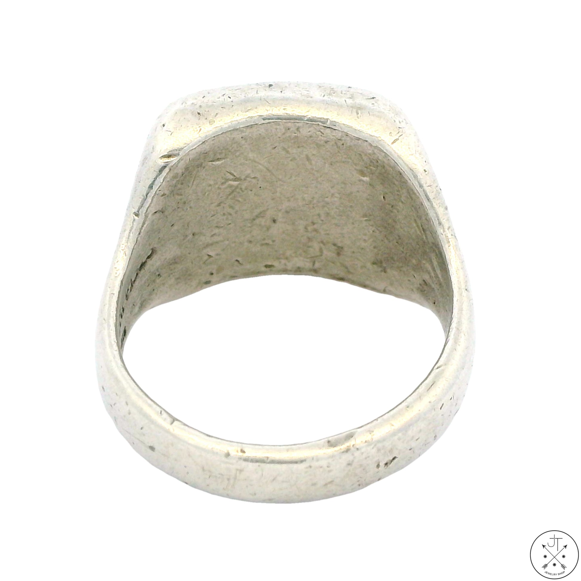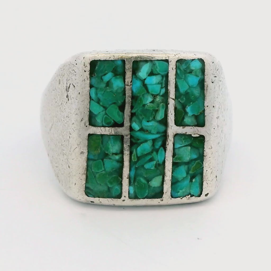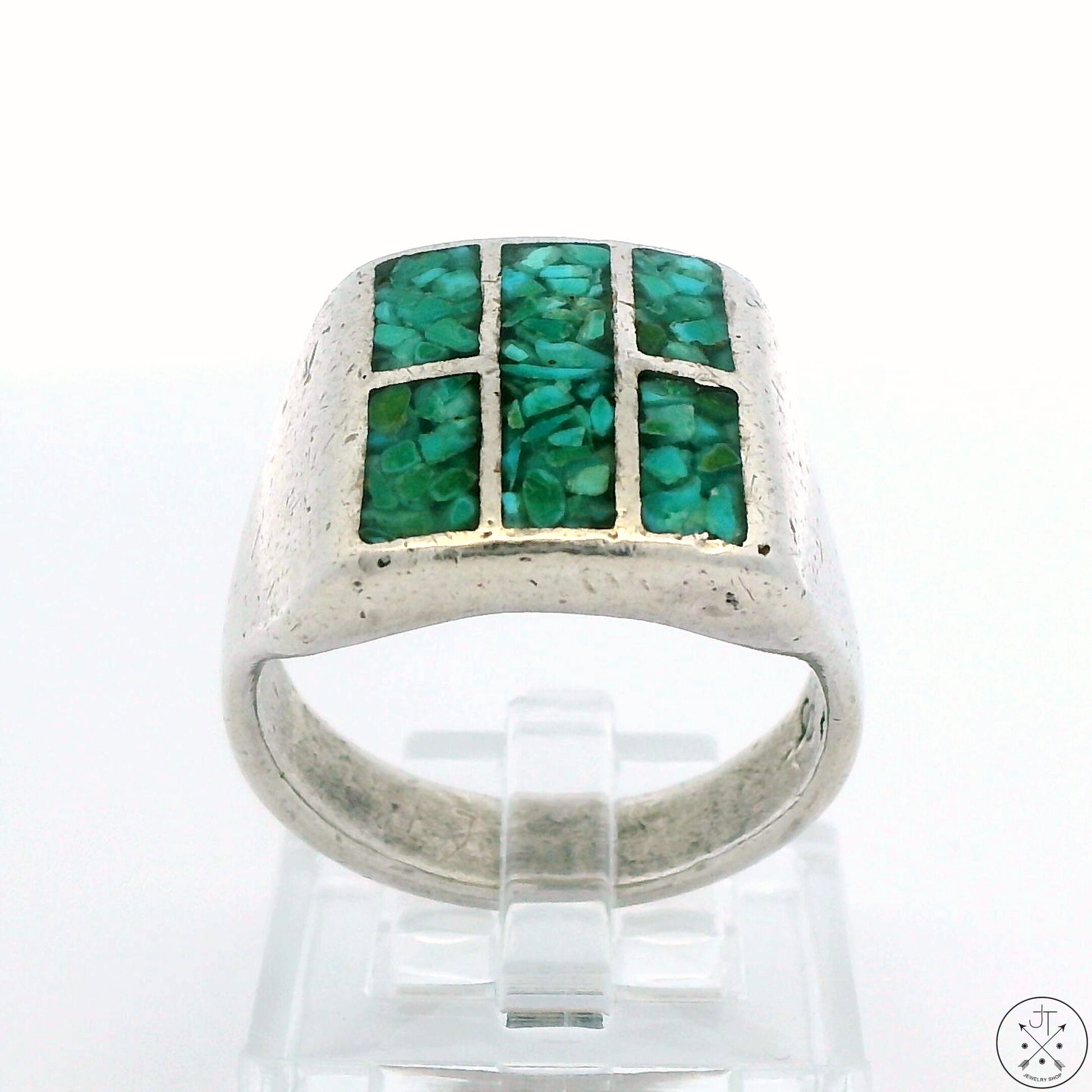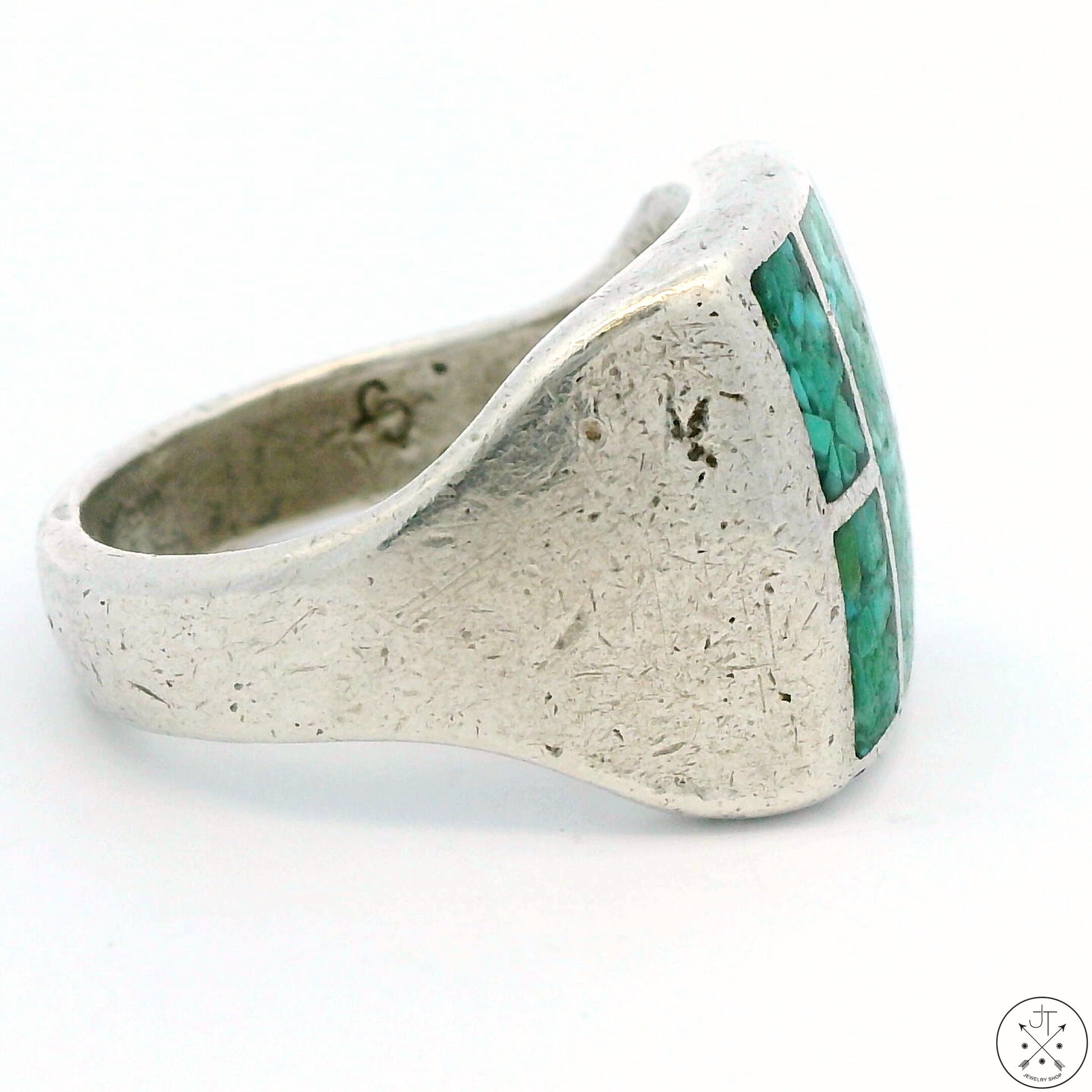 This exquisite 1970s ring features natural Turquoise chips inlaid in a Sterling Silver mounting. Stamped 'sterling' twice and 'CJ' by Navajo Silversmith Corbet Joe, this size 8.75 ring weighs approximately 11.70 grams and is in very good condition for its age, with some visible scratches and pitting but no structural issues. The top of the ring is 16 mm at its widest, tapering to 5 mm at the bottom of the band for comfortable wear.