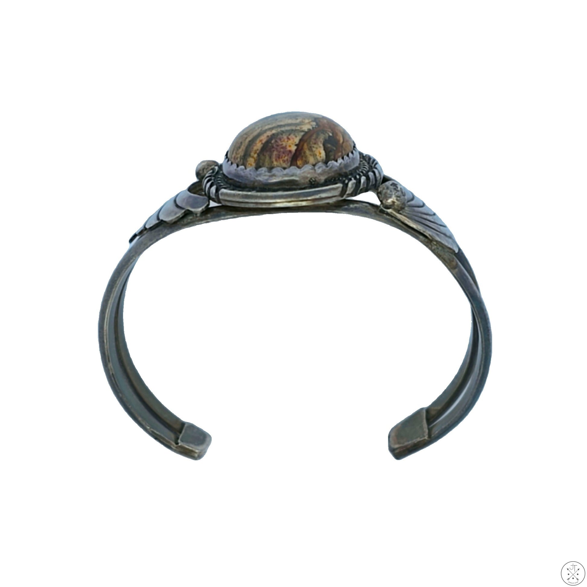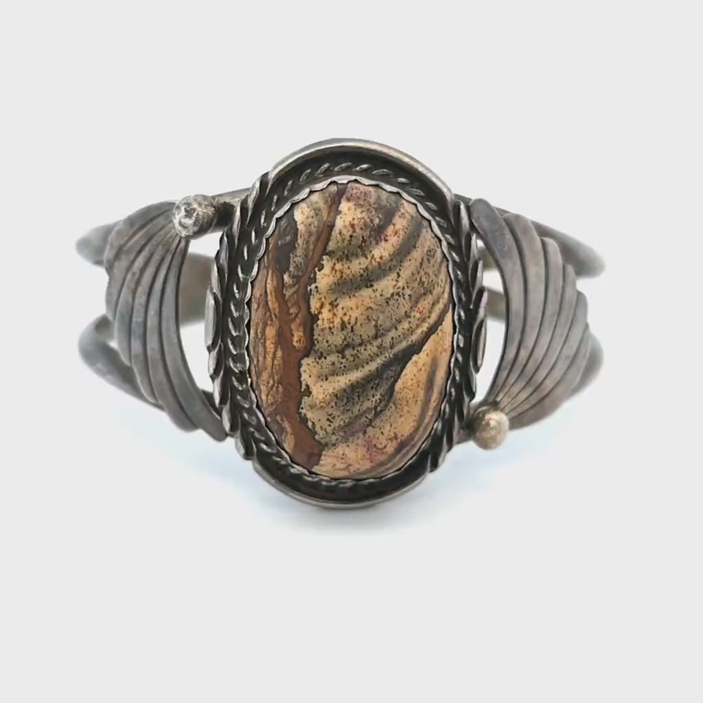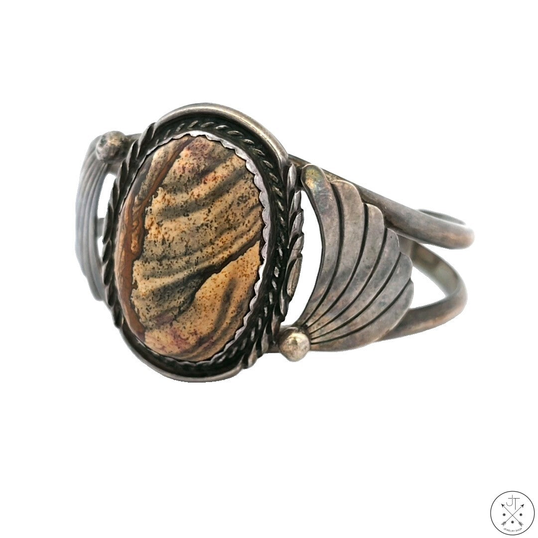 Beautiful vintage Sterling Silver cuff with a natural Biggs County Picture Jasper cabochon with a wonderful pattern of browns and greys. Stamped with the double-feather makers mark of Navajo artist Sandy 'Two Feathers' Sangster, this classy circa 1970s cuff has been cleaned but not polished and is in excellent condition, displaying a dark patina typical of its age. The top of the bracelet is approximately 38.6 mm (1.5 in) at its widest, tapering to 7.6 mm (.3 in) at the 30.8 mm (1.2 in) gap with inner dimensions of 60 mm (2.4 in) wide and 45 mm (1.8 in) tall, creating an inner circumference of approximately 173 mm (6.8 in), Ladies size L or Mens size S. Weight is approximately 44.80 grams.