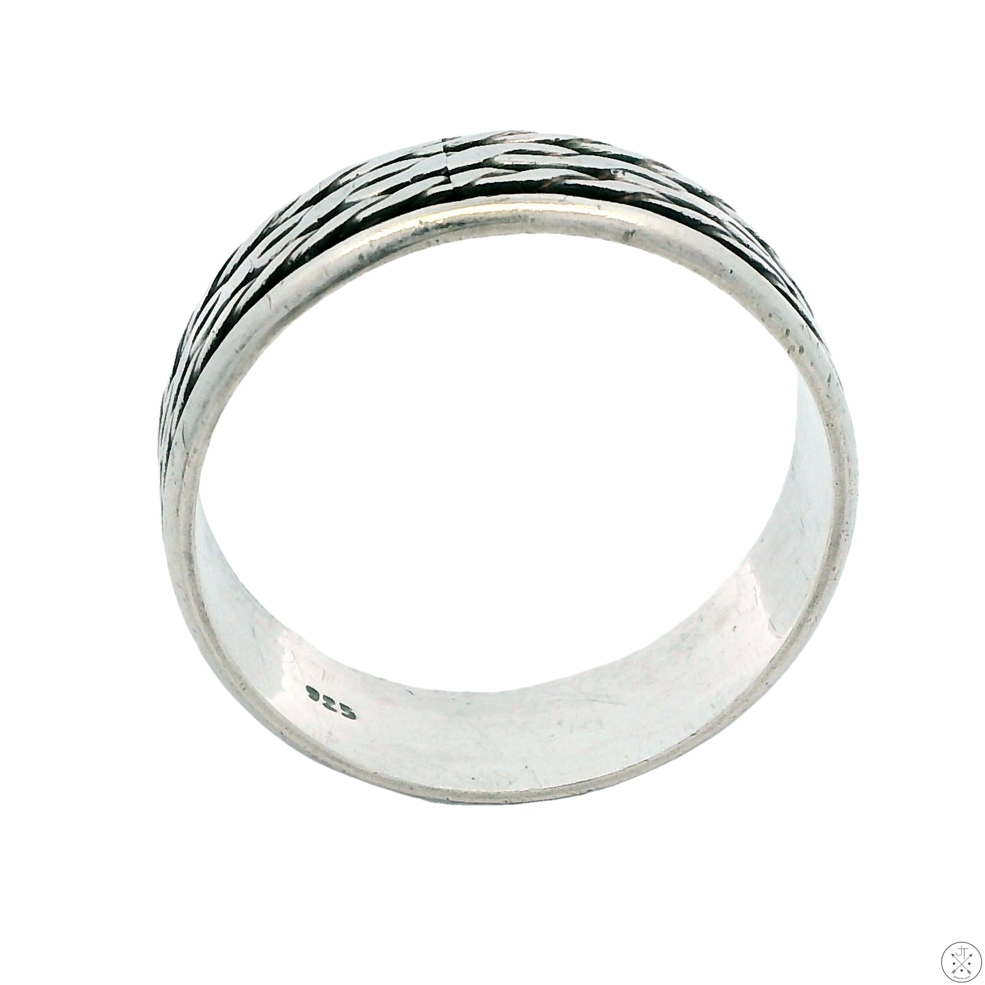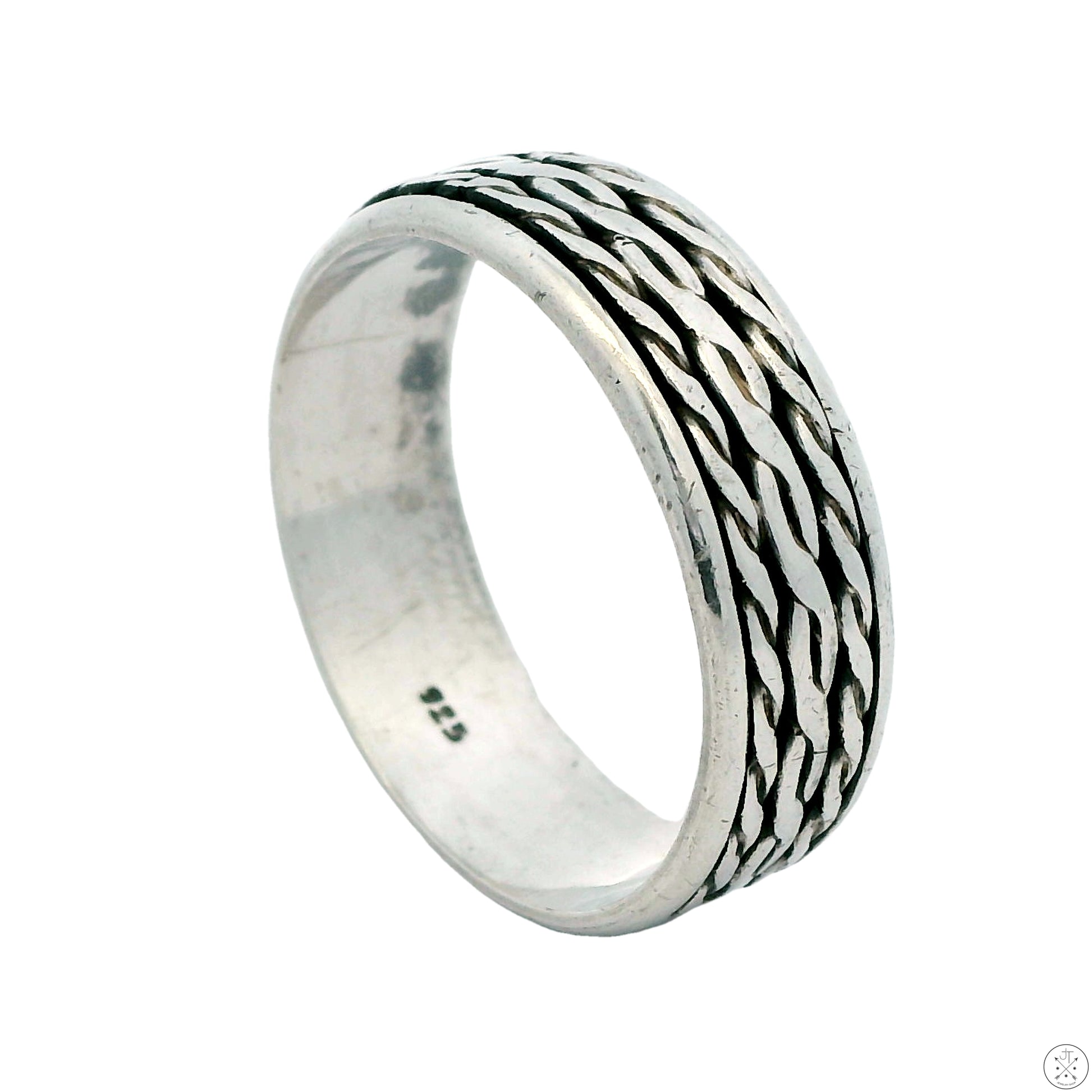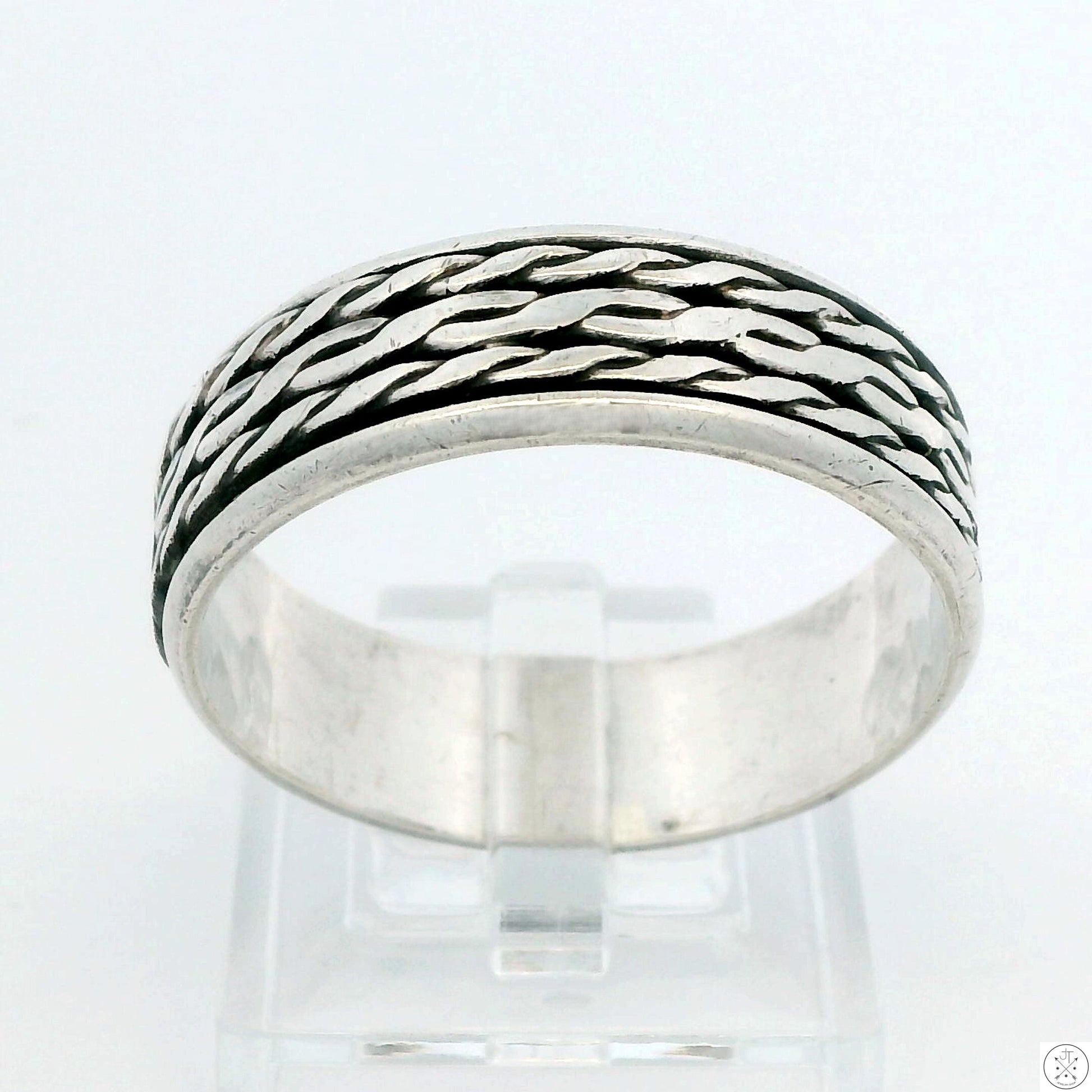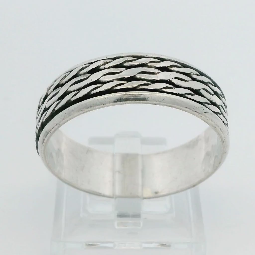 For good luck, this is a vintage solid Sterling Silver spinner band - a 7.6 mm wide size 13.5 outer band with a geometric rope-patterned spinning center. Its sleek design and vintage look make it a standout piece, perfect for those who appreciate understated luxury. Stamped '925', this handmade vintage ring is in very good condition for its age with typical wear, and has been cleaned but not polished.