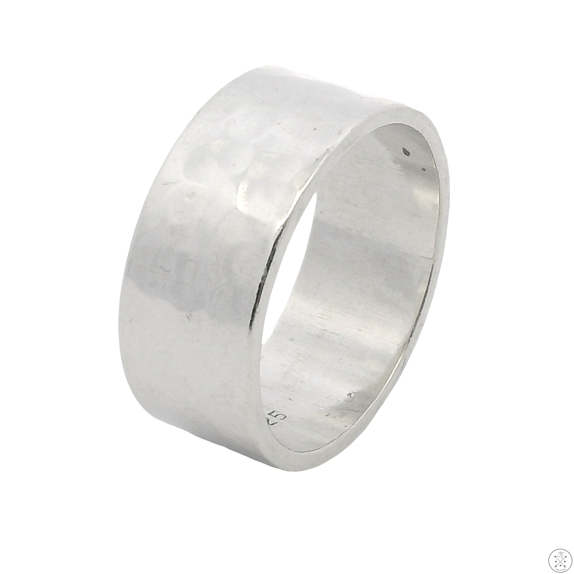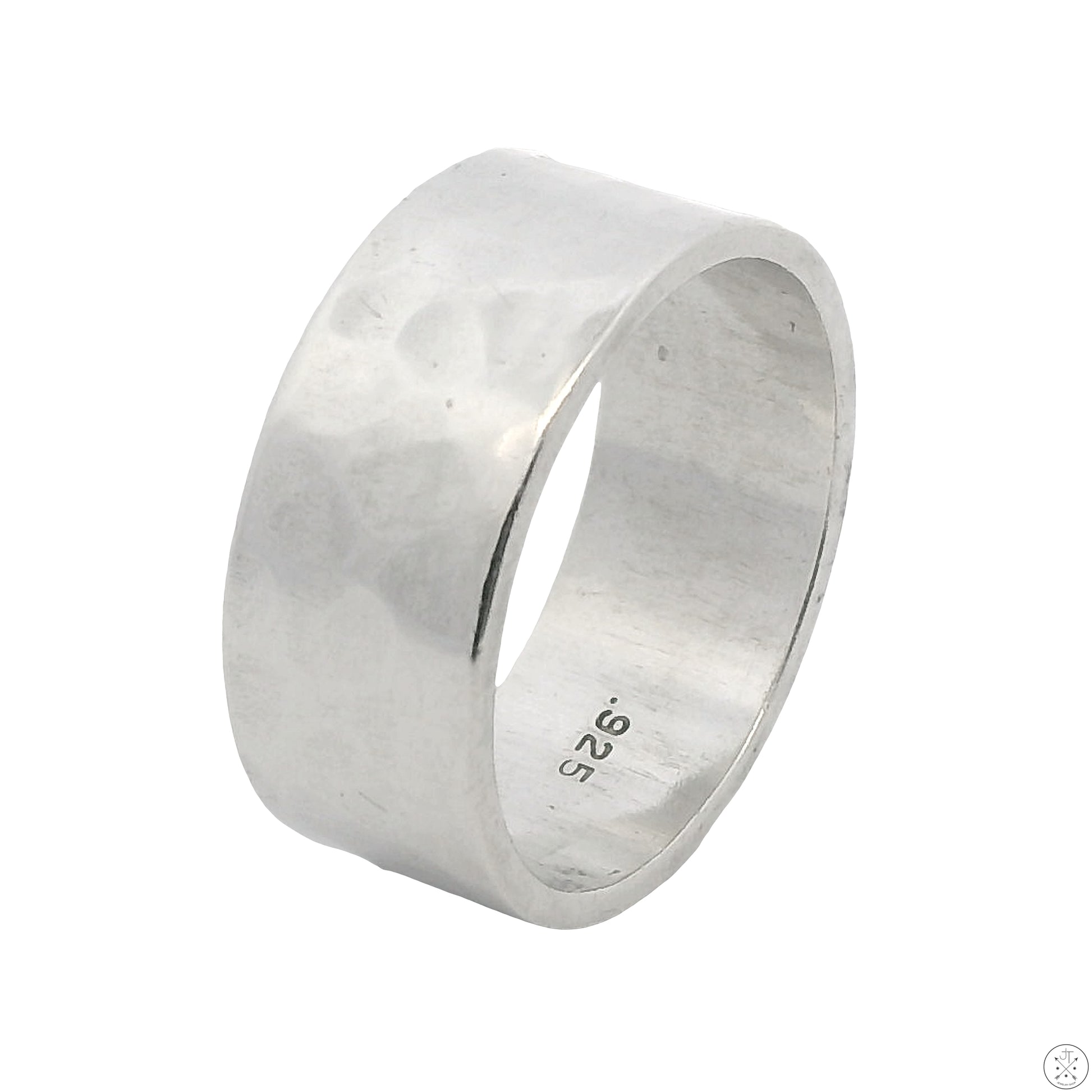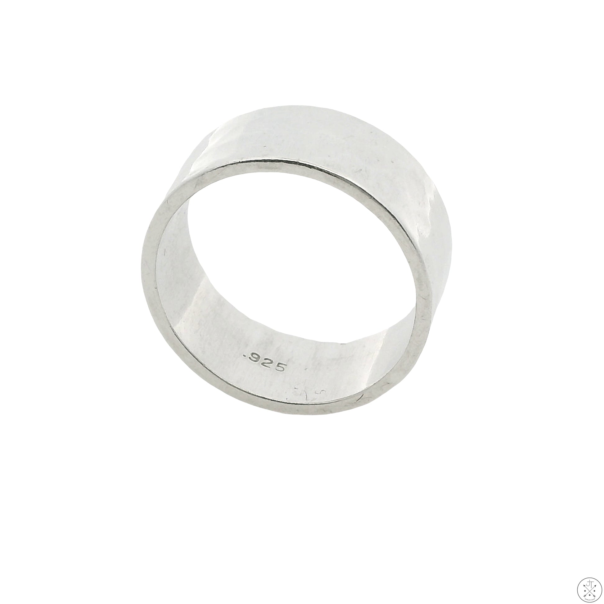 Solid Sterling Silver 8 mm wide size 7 band with a hand-hammered finish. Its sleek design and sparkling finish make it a standout piece, perfect for those who appreciate understated luxury. Stamped '.925', this classy band weighs approximately 5.32 grams and is in very good condition. This handmade vintage band has been cleaned but not polished.
