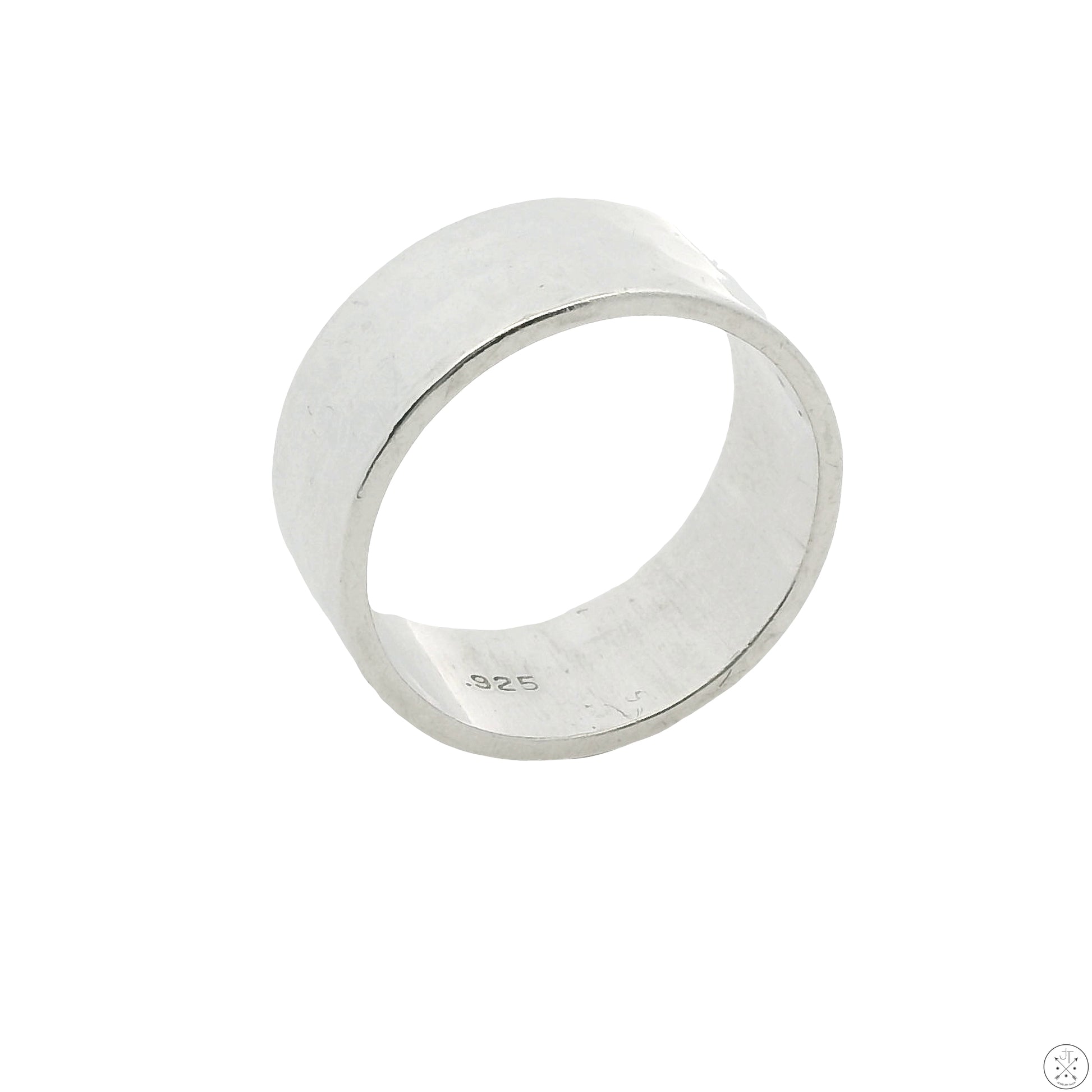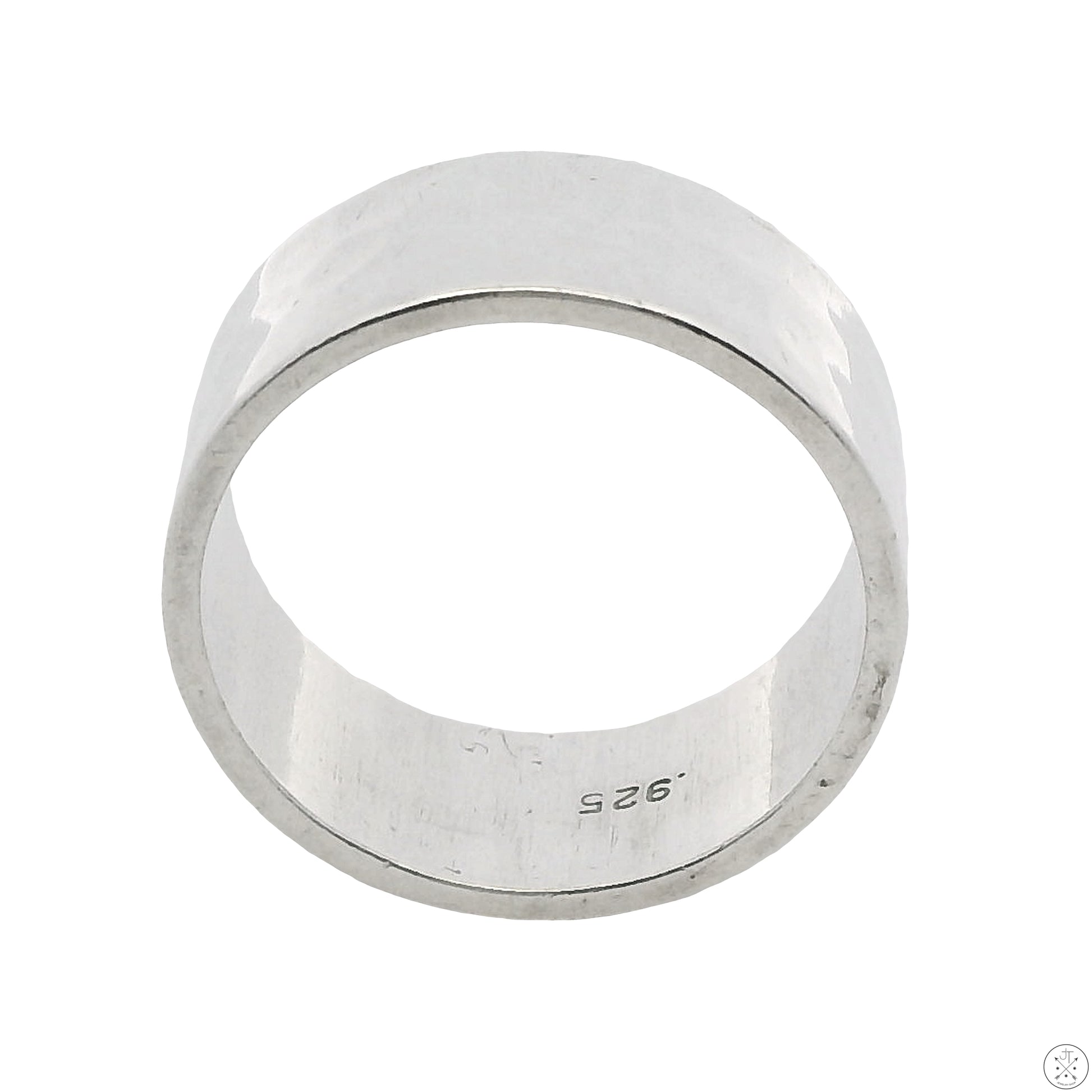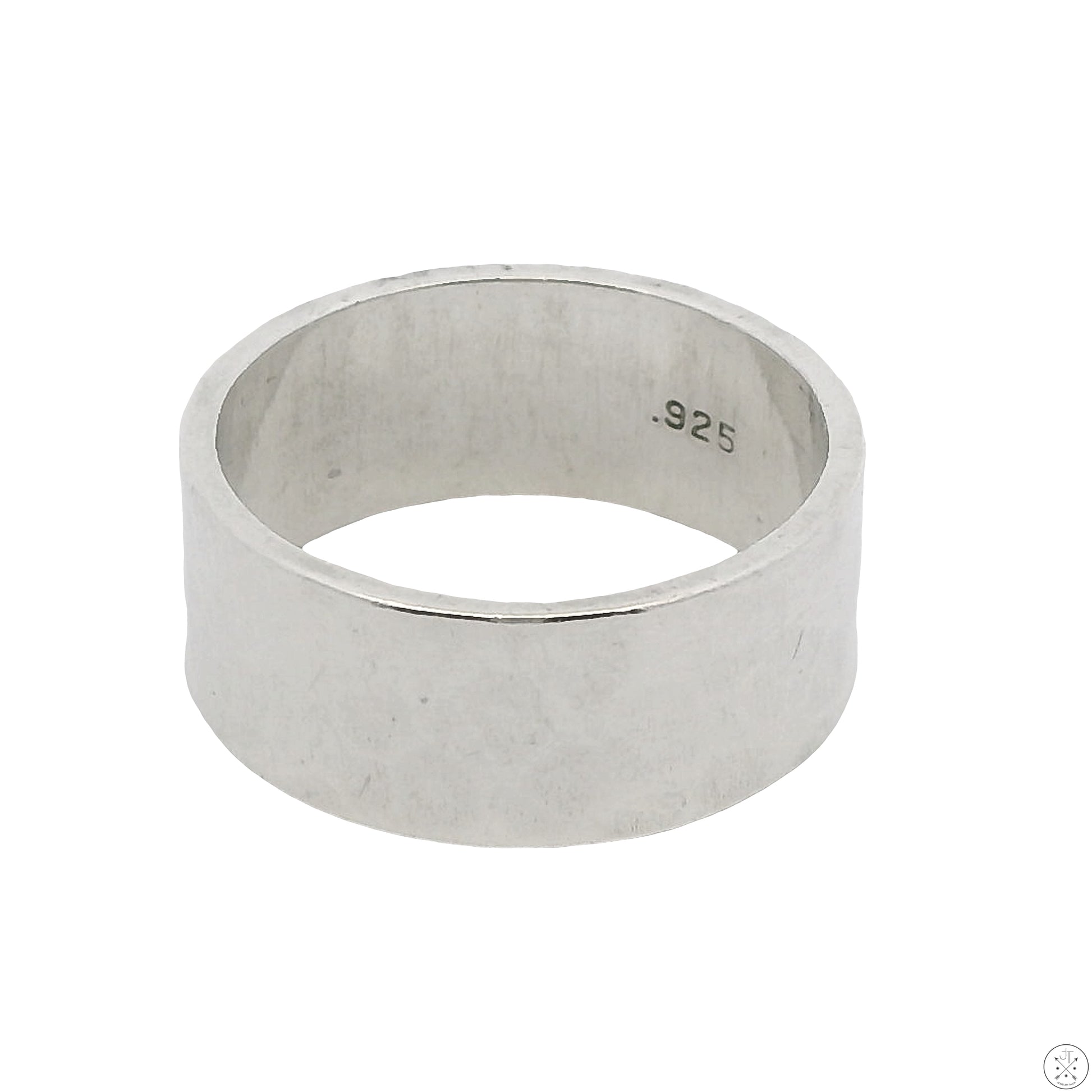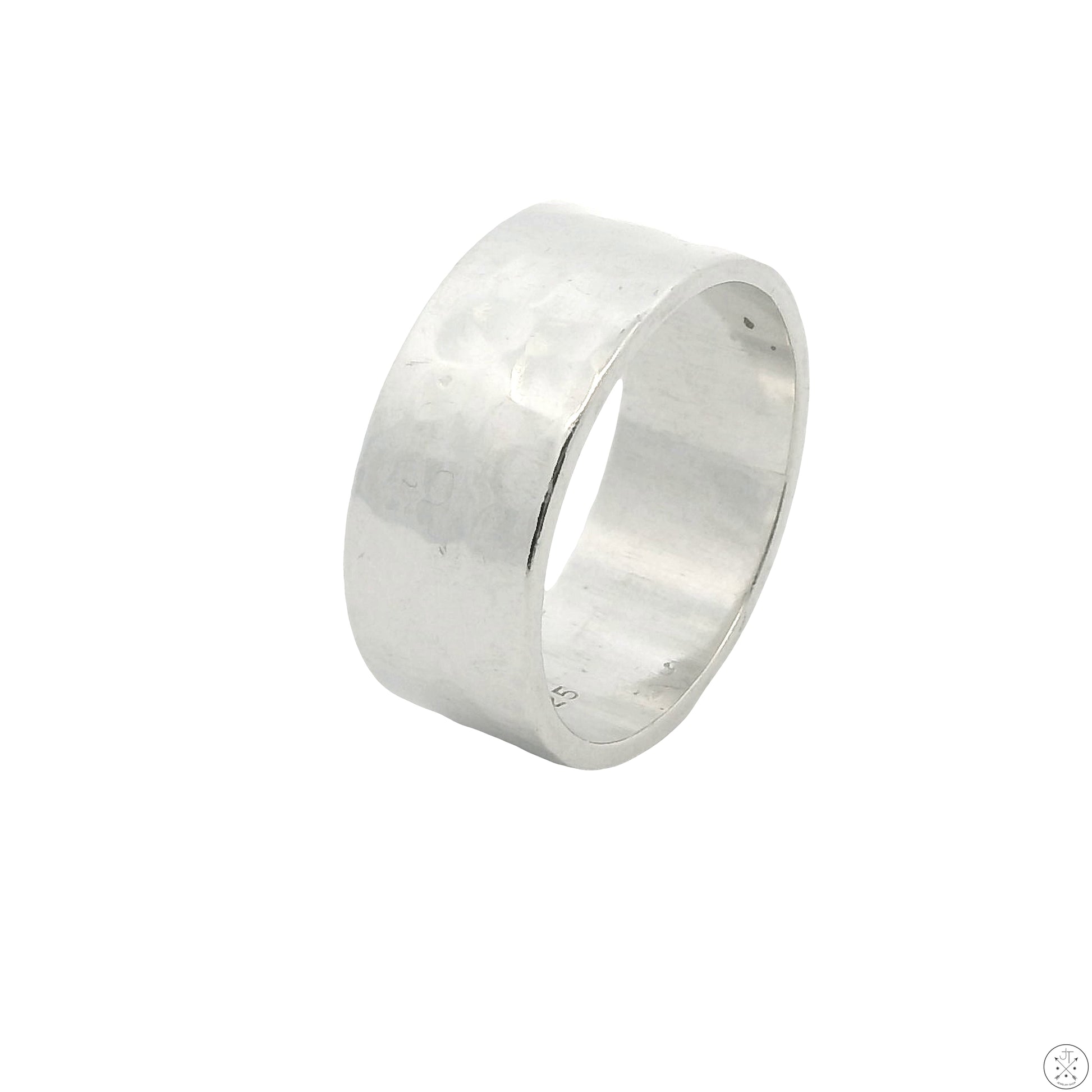 Solid Sterling Silver 8 mm wide size 7 band with a hand-hammered finish. Its sleek design and sparkling finish make it a standout piece, perfect for those who appreciate understated luxury. Stamped '.925', this classy band weighs approximately 5.32 grams and is in very good condition. This handmade vintage band has been cleaned but not polished.