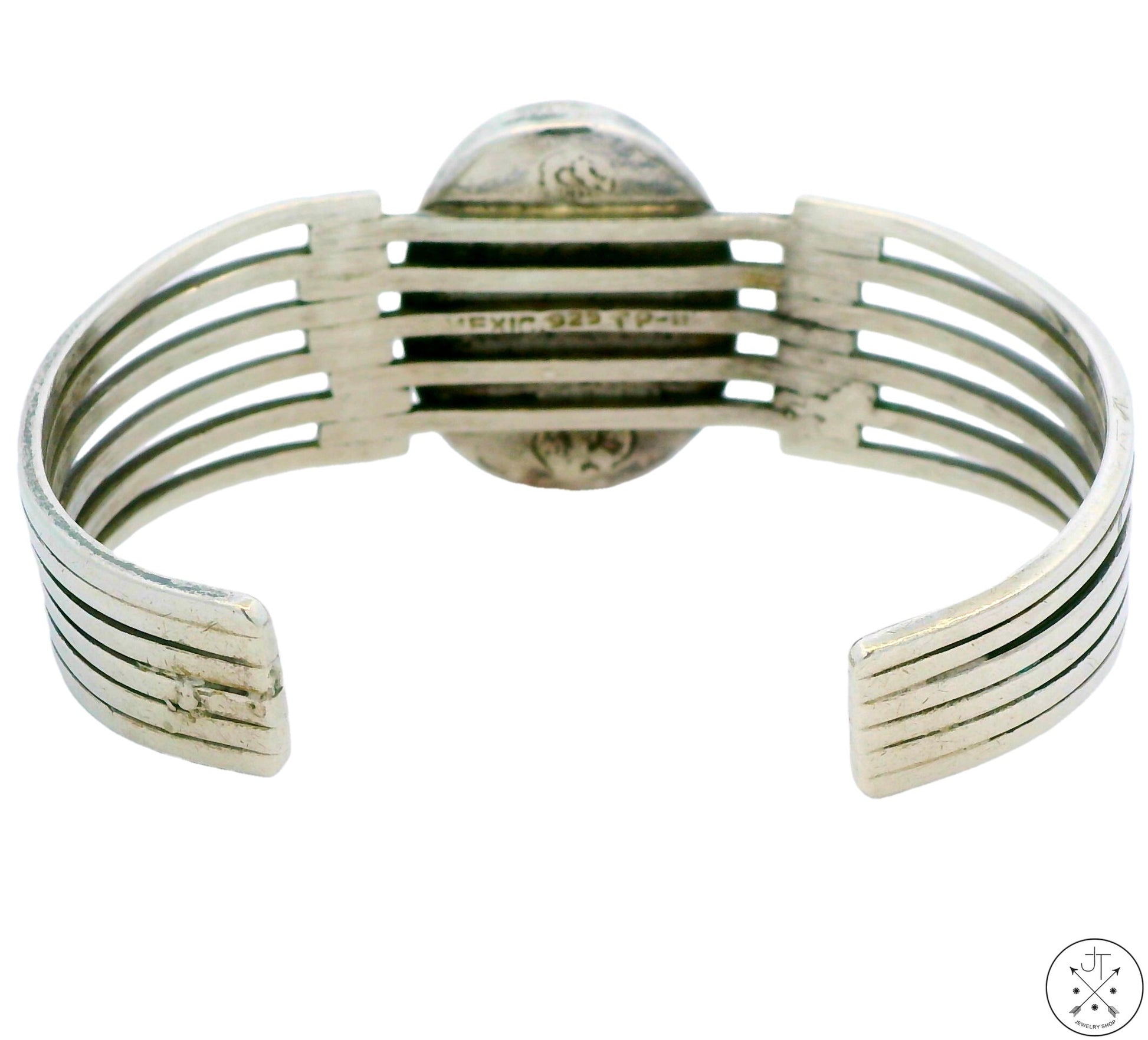 Wonderful vintage Sterling Silver cuff with a beautiful blue and green bezel set natural Chrysocolla cabochon. The top of the bracelet is approximately 30 mm wide, with inner dimensions of 63 mm (2.5 in) wide and 41 mm (1.6 in) tall with a 31 mm (1.2 in) gap, creating an inner circumference of of approximately 175 mm (6.9 in), Ladies size L or Mens size S. Stamped 'mexico 925 tp-112', this wonderful circa 1990s cuff has been cleaned but not polished, weighs approximately 36.56 grams and is in pre-owned condition.