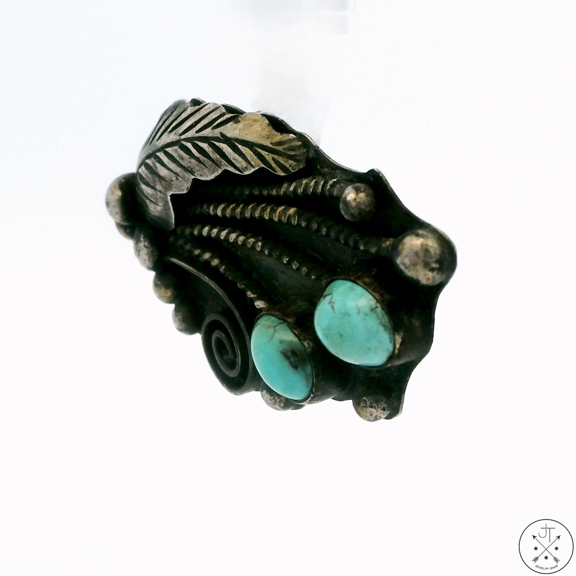 This classy Sterling Silver leaf brooch combines intricate detailing with 2 bluish-green natural Turquoise cabochons from the Bonanza mine, making it a perfect accessory for any outfit. Its unique design combines art and nature, adding a touch of elegance and charm to your look. This wonderful 1980s piece weighs approximately 16.30 grams and measures approximately 31 mm tall x 53 mm wide as worn. Although unstamped, this handmade brooch has been independently tested to be made of sterling silver. This brooch has been lightly cleaned but not polished, displaying a dark patina typical of age and wear.