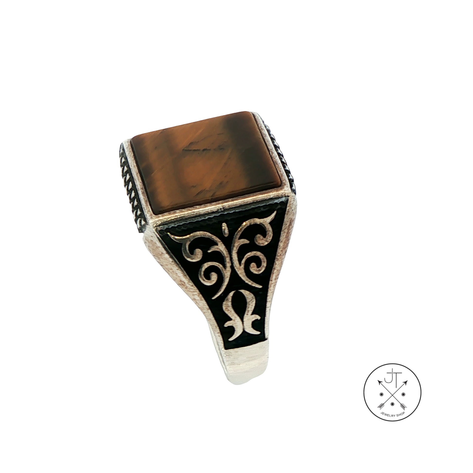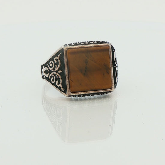 This exquisite Men's ring features a simple yet striking pattern and an approximately 12.6 mm square bezel-set flat-top natural Tiger's Eye set in a Sterling Silver mounting. The antiqued Silver perfectly accents the golden browns of the gemstone, making this a perfect statement piece for any jewelry collection. Stamped '925', this classy size 12.25 ring weighs approximately 7.20 grams and is in excellent pre-owned condition. The top of the ring is approximately 15.8 mm at its widest, tapering to 3.15 mm at the bottom of the band for comfortable wear.