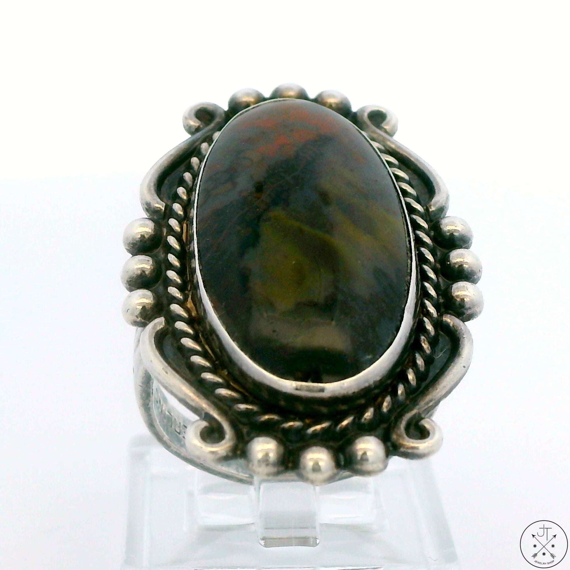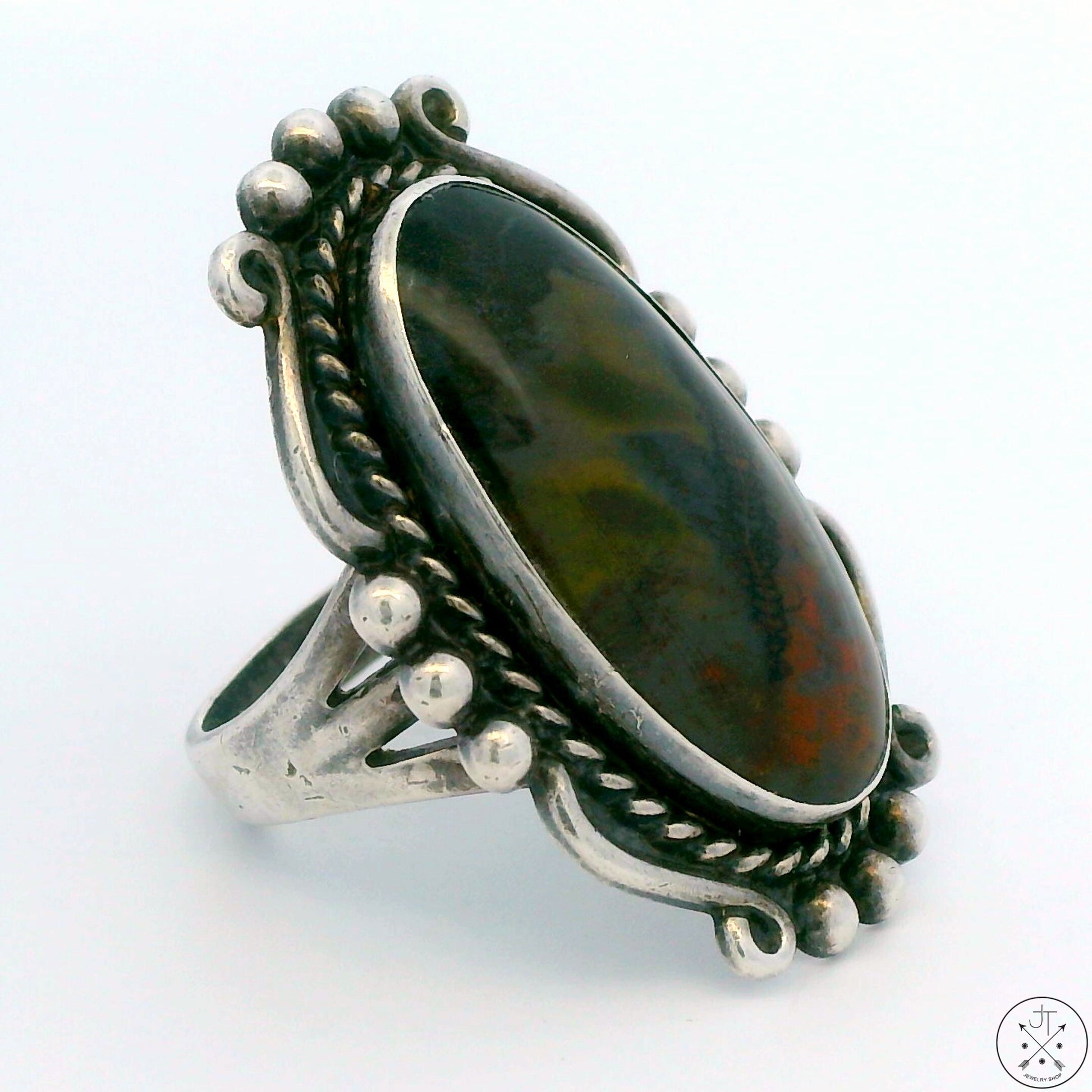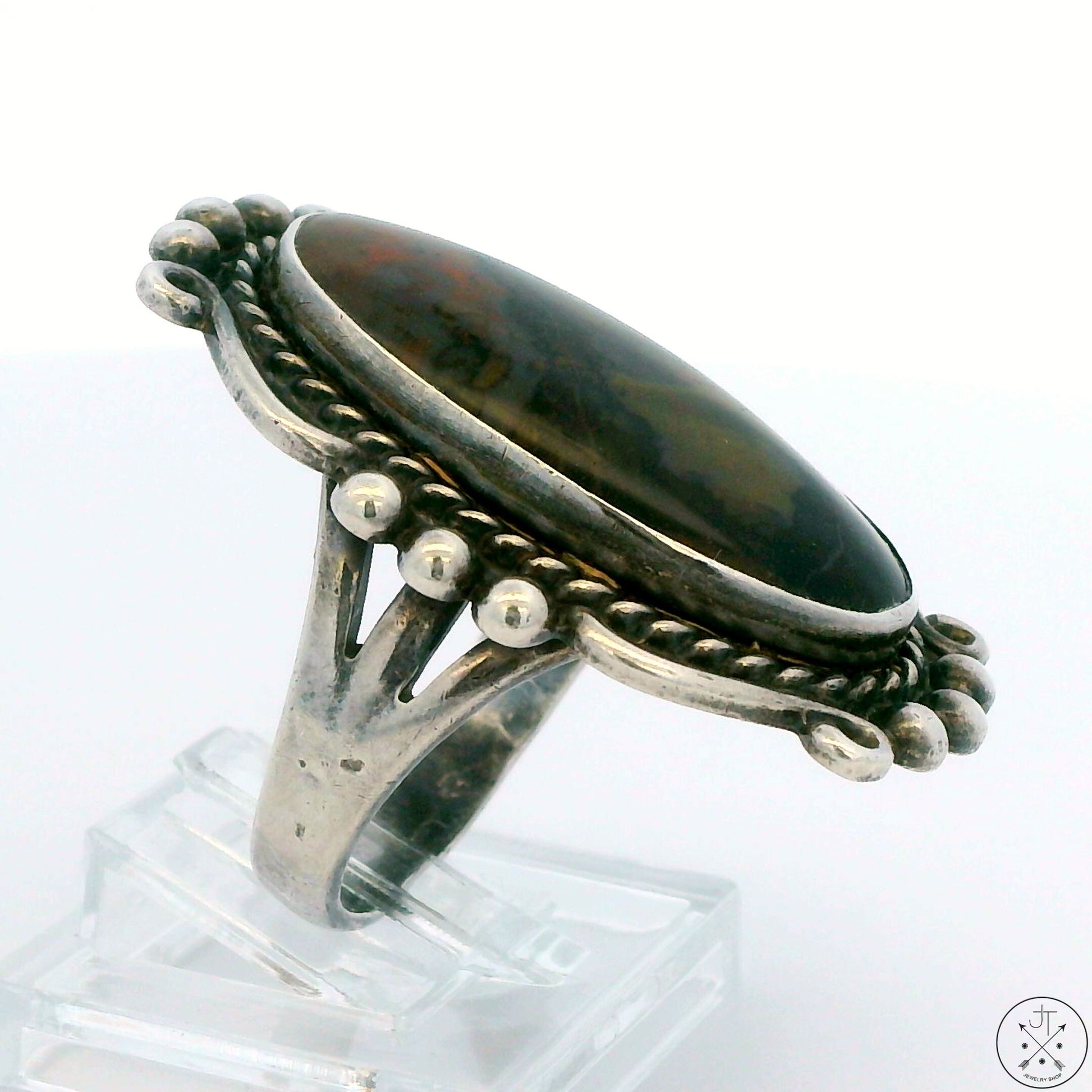 This exquisite vintage ring features a stunning 25 mm x 12.5 mm Moss Agate cabochon bezel-set in a beautifully crafted Sterling Silver band. The green, black, and red wisps of color in the gemstone add a touch of mystery to the ring, making it a perfect statement piece for any jewelry collection. Stamped 'sterling' on the inside of the band, this size 7.5 ring weighs approximately 10.81 grams and has a Native American style to it, but we cannot attribute it to any specific Silversmith or Tribe. The top of the ring is 34.1 mm at its longest, tapering to 3.4 mm at the bottom of the band. The ring displays a dark patina typical of its age and has been cleaned but not polished.