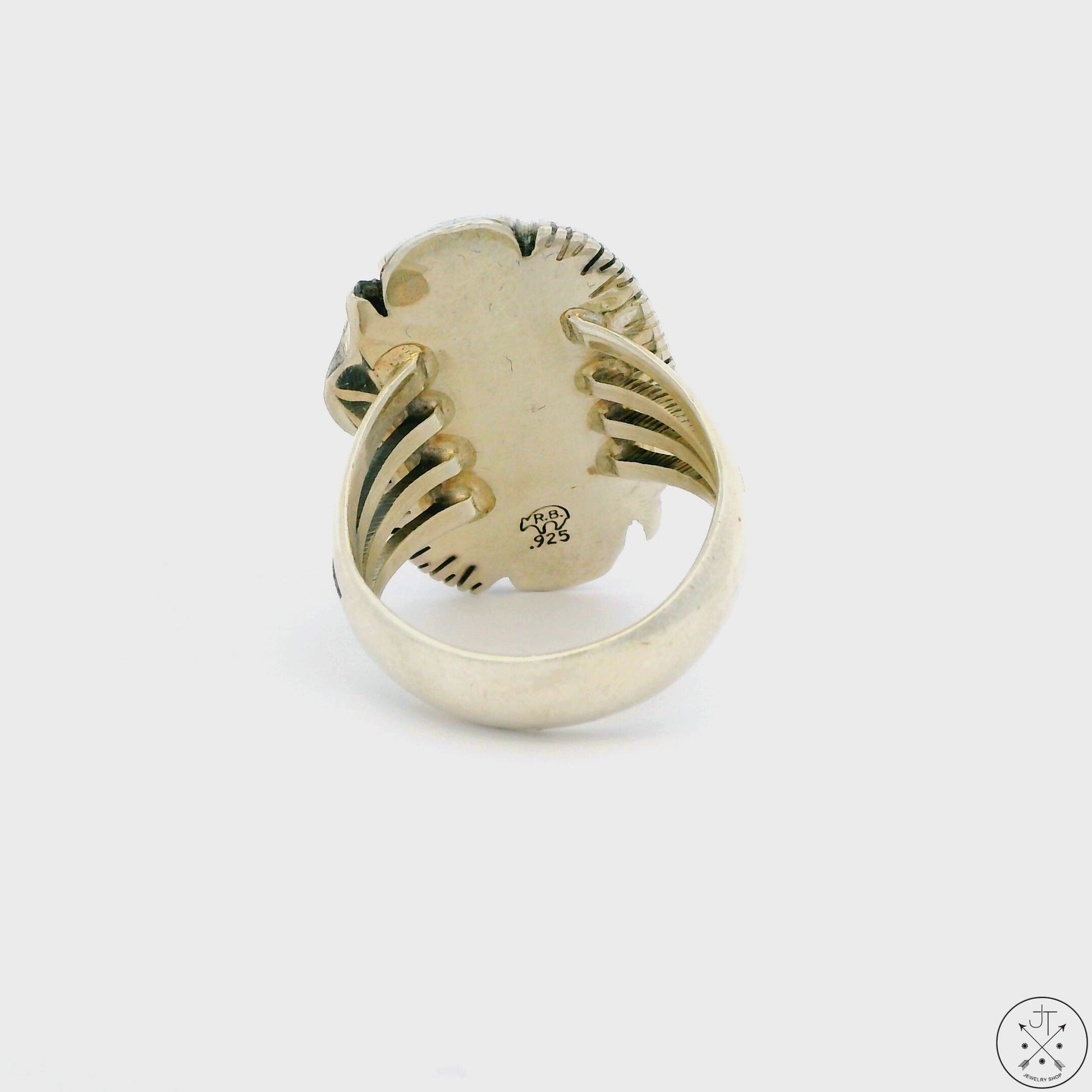 This exquisite ring features a striking 23 mm x 12 mm Turquoise cabochon bezel set in a beautifully crafted Sterling Silver band. The artistic design and high-quality finish make it a must-have for jewelry enthusiasts seeking a blend of tradition and modernity. Stamped with a 'Running Bear' store mark and '.925', this classy size 9.5 vintage ring was made by Navajo Silversmith Sheena Jack. The top of the ring is 30.4 mm at its longest, tapering to 6 mm at the bottom of the band. The ring displays a slight patina and has been cleaned but not polished.