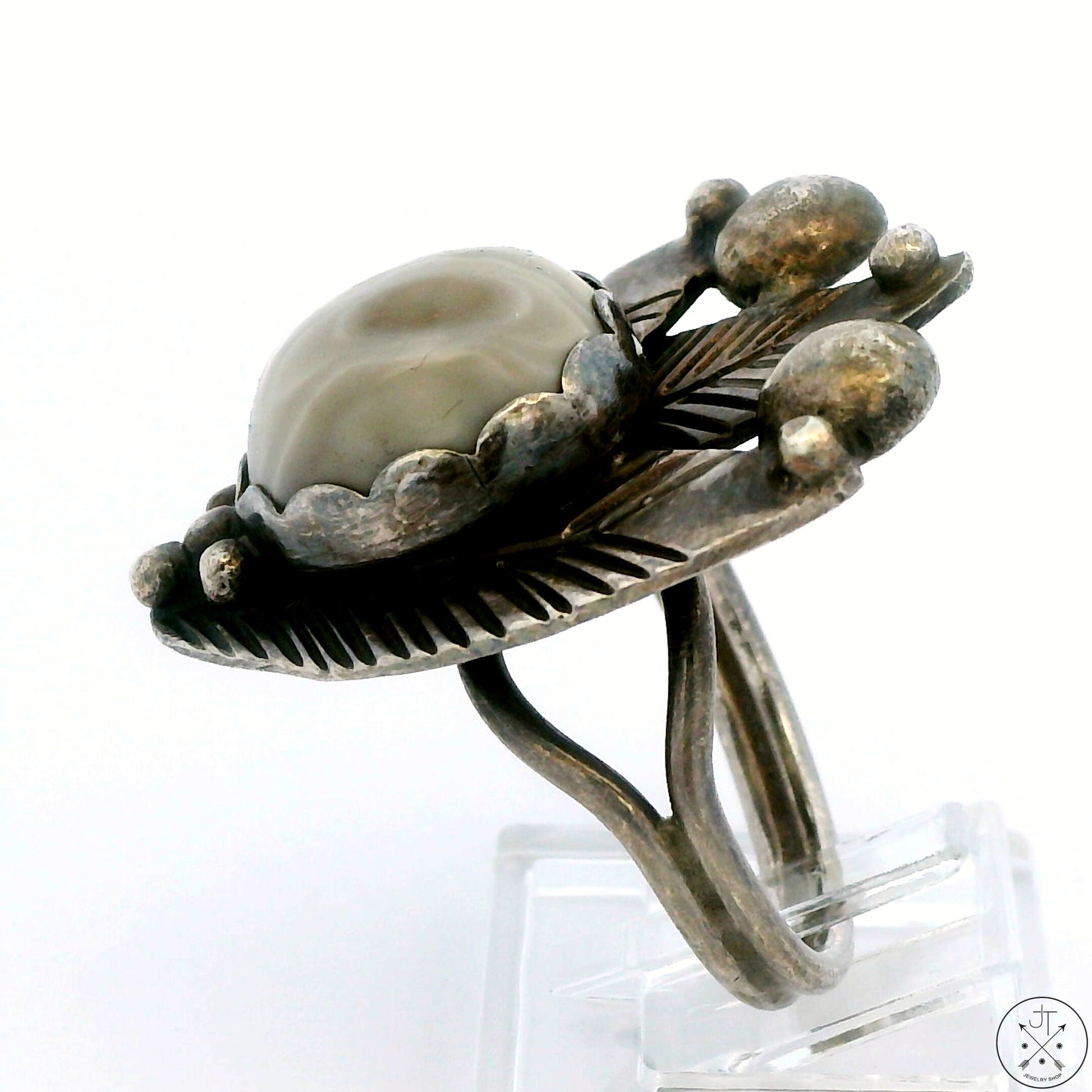 Vintage Sterling Silver Tulip Ring with Flower Agate Cabochon Size 9.25 Signed