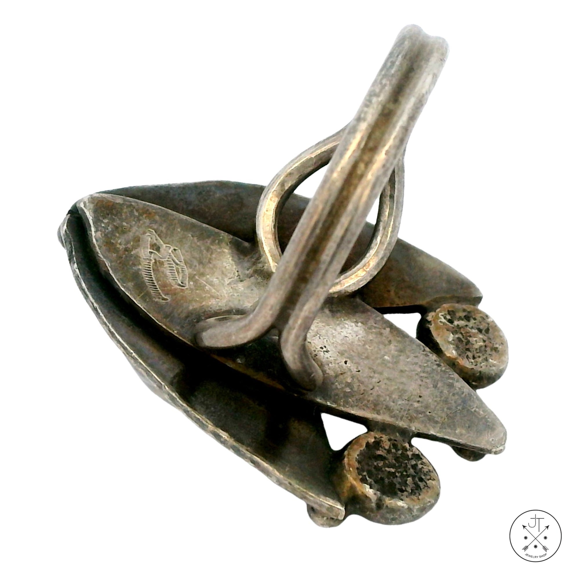 This unique vintage ring features a Flower Agate cabochon bezel set in a Tulip-shaped profile. Although only marked with an etched maker mark, this size 9.25 ring has been independently tested as Sterling Silver, weighs a hefty 20.14 grams, and has a Native American Artisan's style to it, but we cannot attribute the mark to any specific Silversmith. The large Tulip is approximately 31.7 mm x 23.2 mm, and the bottom of the unique band is 3.24 mm. The ring displays a dark patina typical of its age and has been cleaned but not polished.